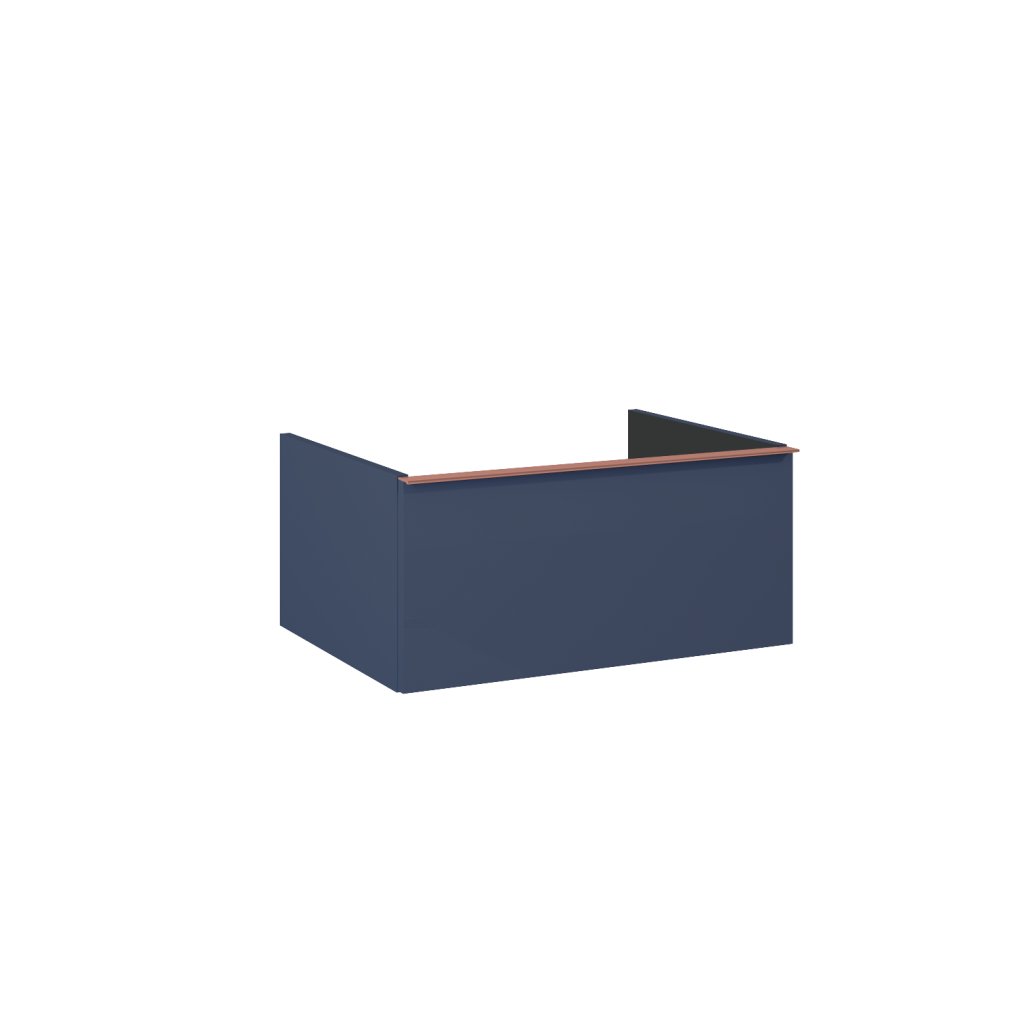 Skříňka pro umyvadla na desku ze série Look o šířce 60 cm, bez vrchní části, 1 zásuvka s tichou samozavírací funkcí a úplným vysouváním. Skříňka vyrobená z materiálů odolných vůči vlhkosti, přední část a tělo lakované matnou modrou barvou (Navy Blue). Výrobek funguje jako umyvadlová skříňka pomocí pracovní desky a sifonu, který šetří místo.