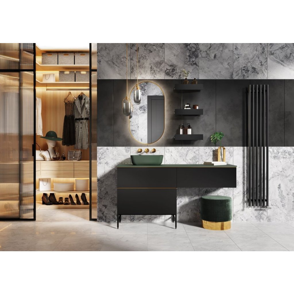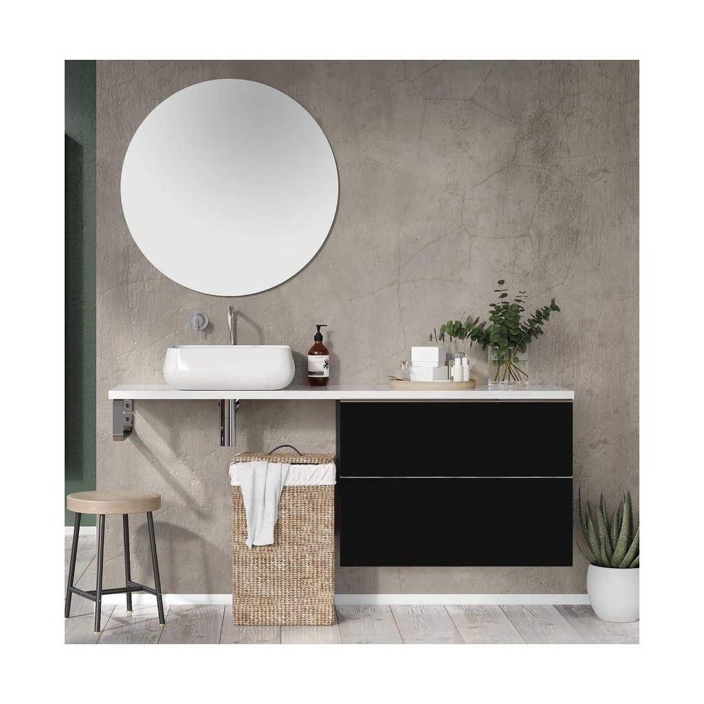 Skříňka pro umyvadla na desku ze série Look o šířce 60 cm, bez vrchní části, 2 zásuvky s tichou samozavírací funkcí a úplným vysouváním. Skříňka vyrobená z materiálů odolných vůči vlhkosti, přední část a tělo lakované matnou černou barvou. Výrobek funguje jako umyvadlová skříňka pomocí pracovní desky a sifonu, který šetří místo.