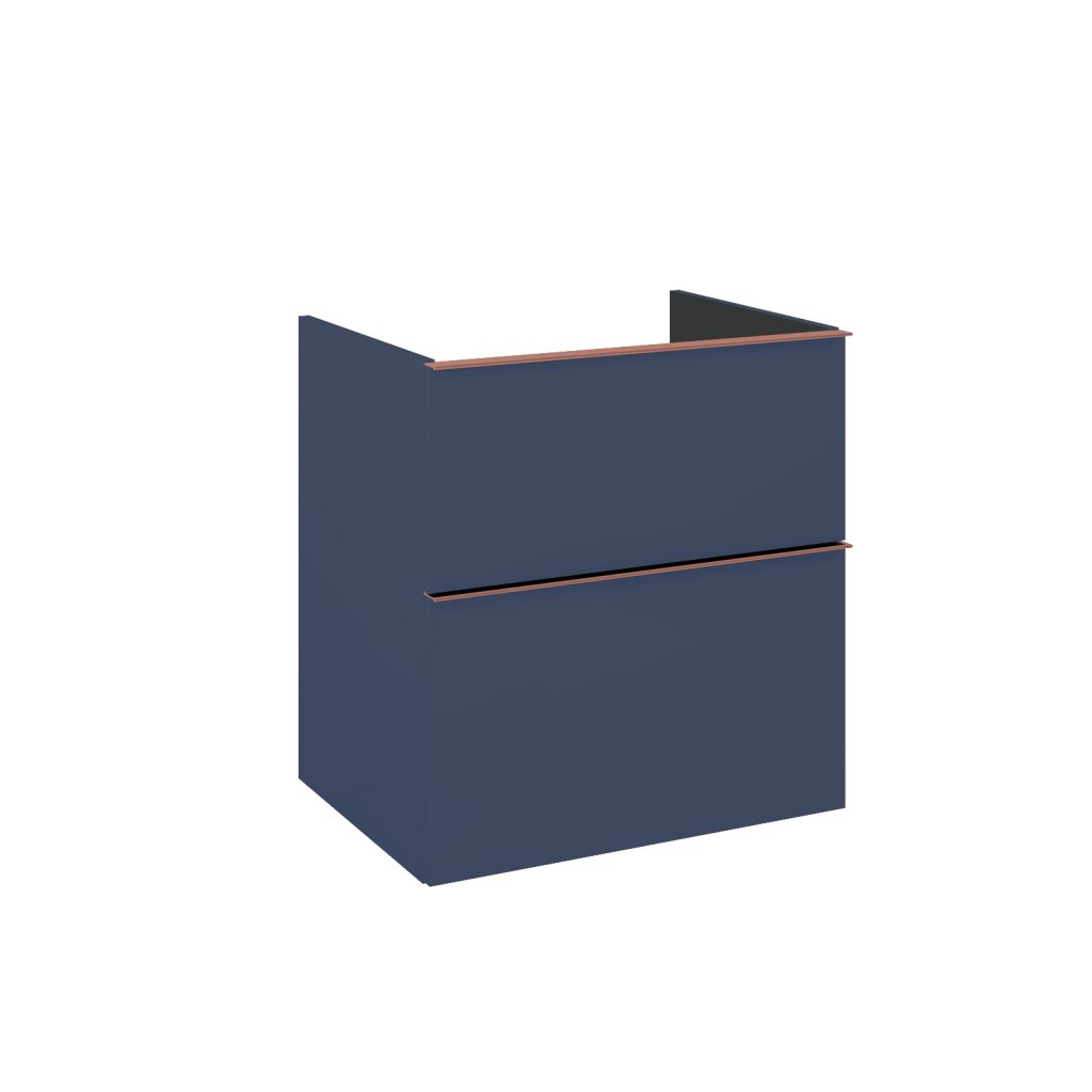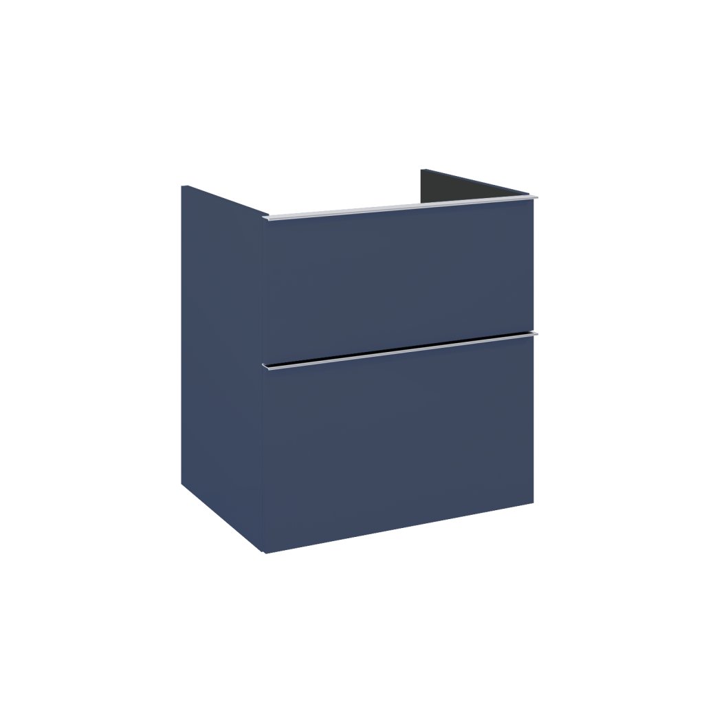 Skříňka pro umyvadla na desku ze série Look o šířce 60 cm, bez vrchní části, 2 zásuvky s tichou samozavírací funkcí a úplným vysouváním. Skříňka vyrobená z materiálů odolných vůči vlhkosti, přední část a tělo lakované matnou modrou barvou. Výrobek funguje jako umyvadlová skříňka pomocí pracovní desky a sifonu, který šetří místo.