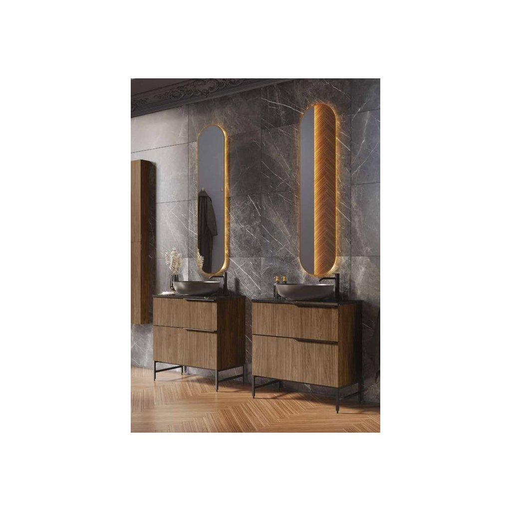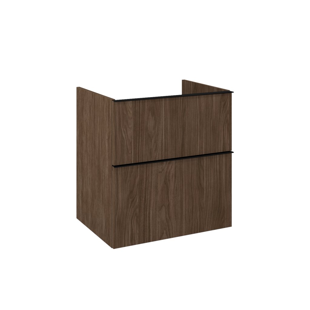 Skříňka pro umyvadla na desku ze série Look o šířce 60 cm, bez vrchní části, 2 zásuvky s tichou samozavírací funkcí a úplným vysouváním. Skříňka vyrobená z materiálů odolných vůči vlhkosti, přední část a tělo s barvou Ořech Lincoln. Výrobek funguje jako umyvadlová skříňka pomocí pracovní desky a sifonu, který šetří místo.