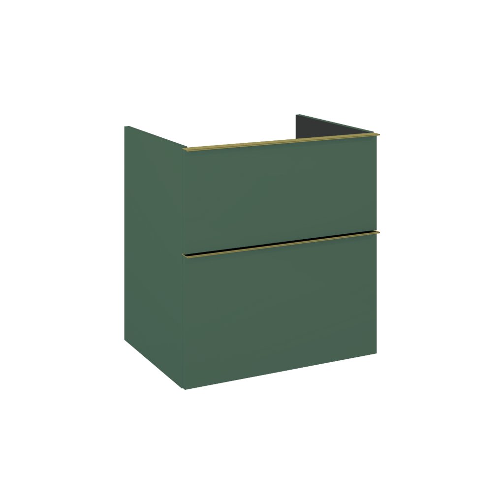 Skříňka pro umyvadla na desku ze série Look o šířce 60 cm, bez vrchní části, 2 zásuvky s tichou samozavírací funkcí a úplným vysouváním. Skříňka vyrobená z materiálů odolných vůči vlhkosti, přední část a tělo lakované matnou zelenou barvou (Forest Green matt). Výrobek funguje jako umyvadlová skříňka pomocí pracovní desky a sifonu, který šetří místo.
