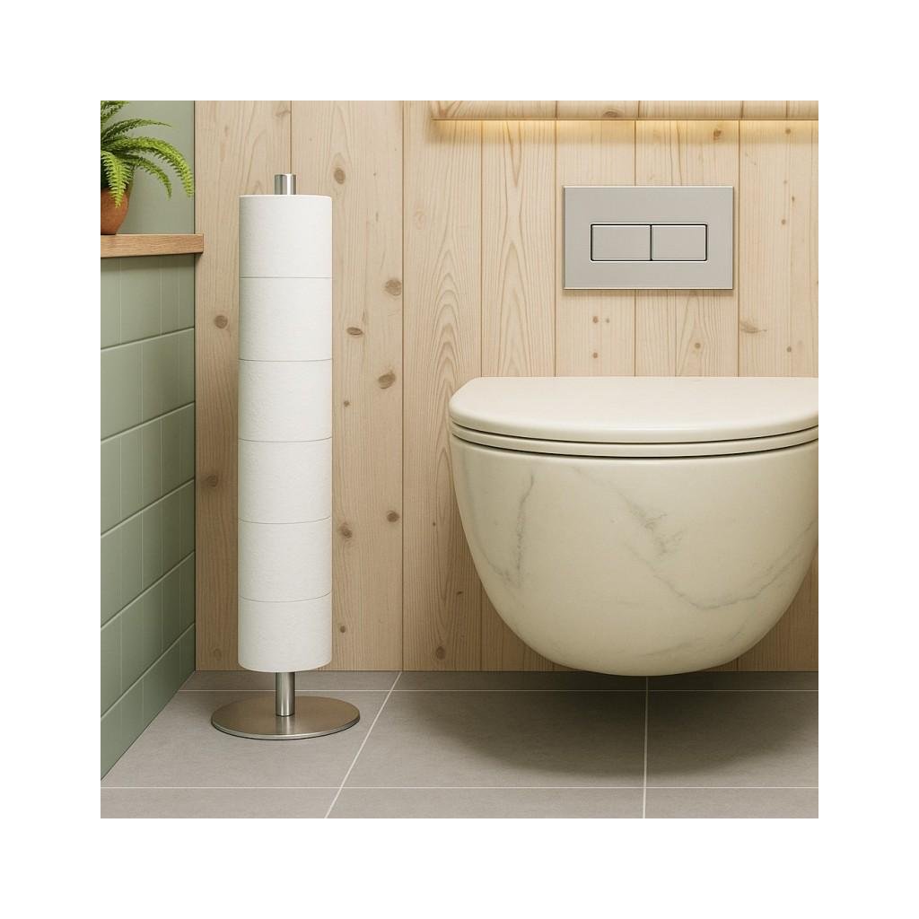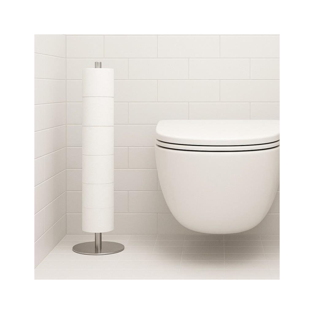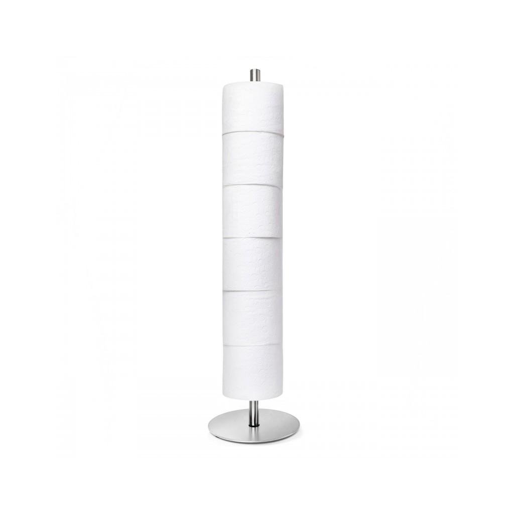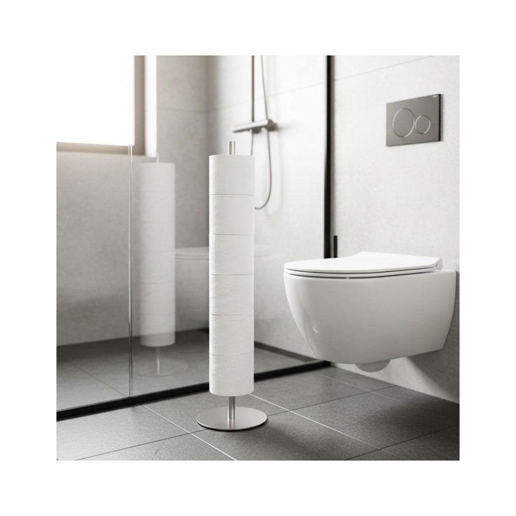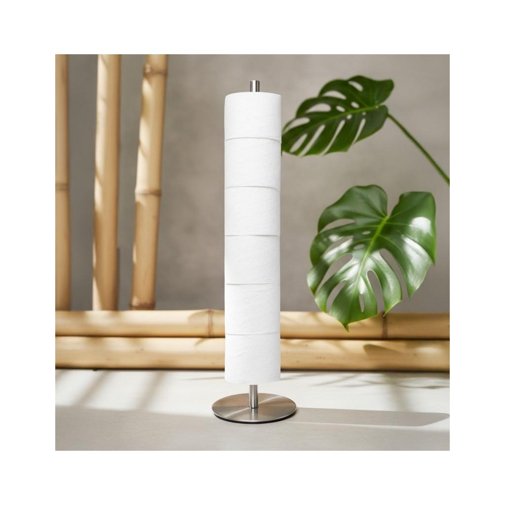 Volně stojící stojan na toaletní papír s kapacitou až 6 rolí je praktickým doplňkem každé koupelny. Vyroben z chromované oceli, v elegantním stříbrném provedení, spojuje funkčnost a moderní design. Stabilní konstrukce a vysoké provedení umožňují pohodlné skladování zásoby papíru.