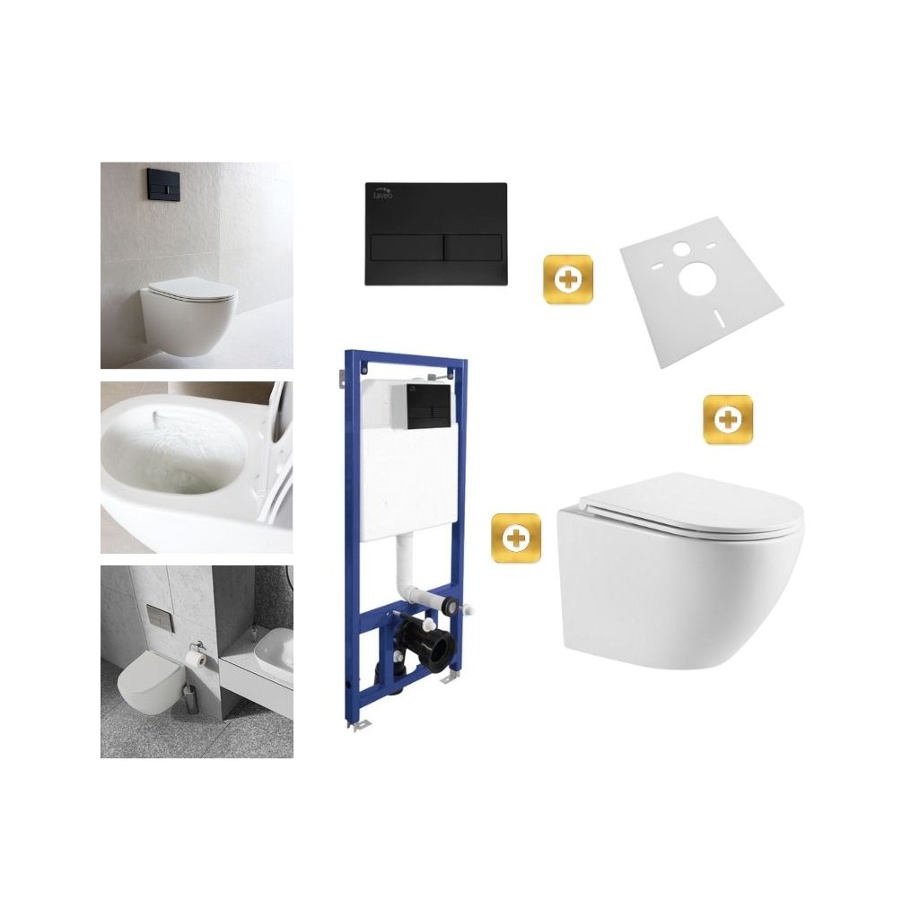 Erga, závěsný set pod omítku Laveo Akan + závěsná WC mísa Lily+ s toaletním sedadlem z duroplastu + černé splachovací tlačítko, Tornado v2.0 splachování