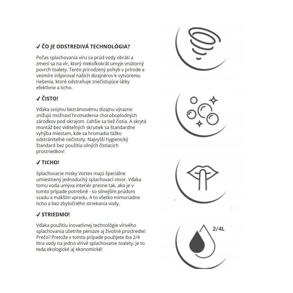 | Tornado 2.0 (vířivý oplach) | 2–3 trysky vytvářejí cirkulující vír po celé míse | Nejvyšší – účinné propláchnutí celé plochy | Optimalizovaná (méně vody, lepší účinek) | Tišší splachování | Ne (splachování je skryto)** |