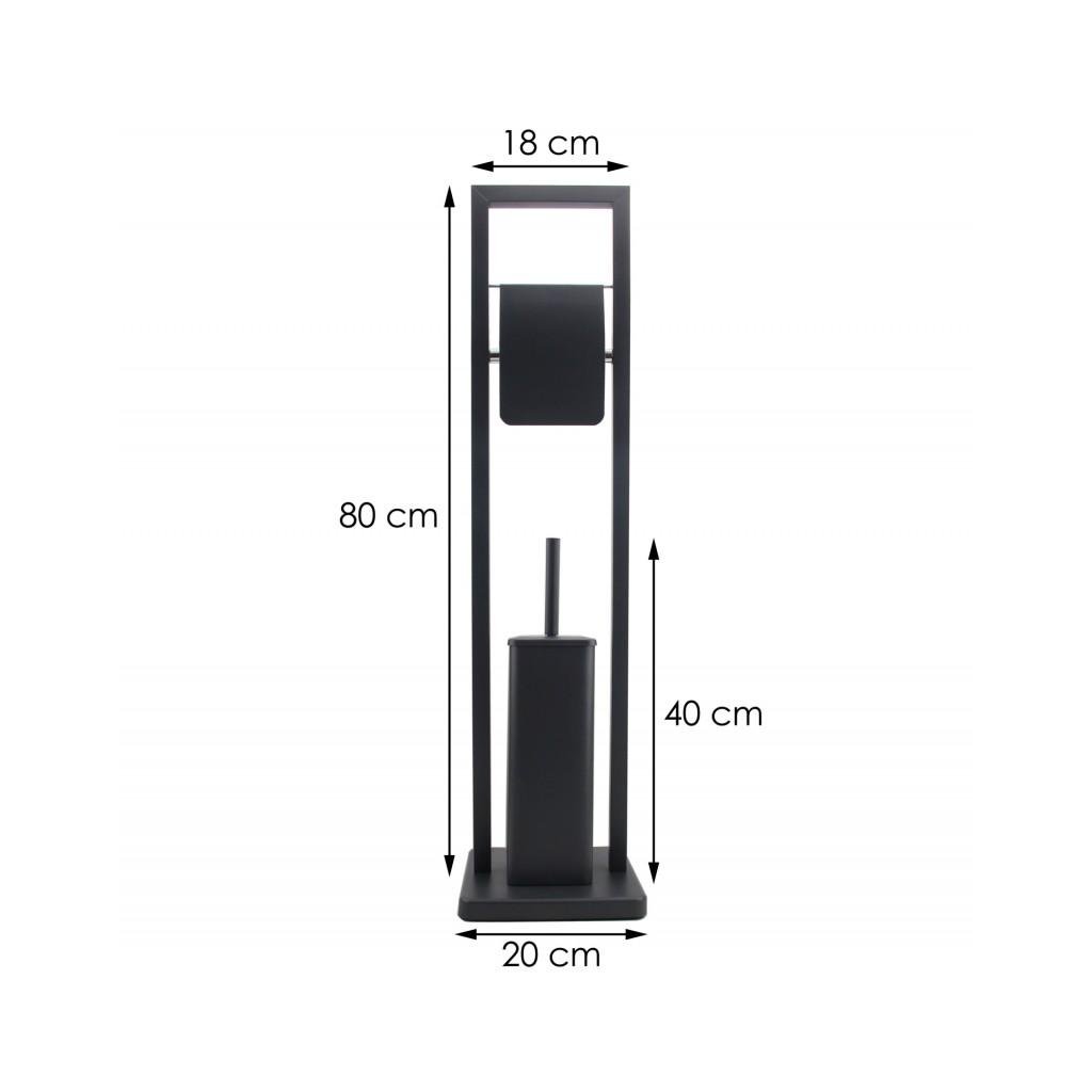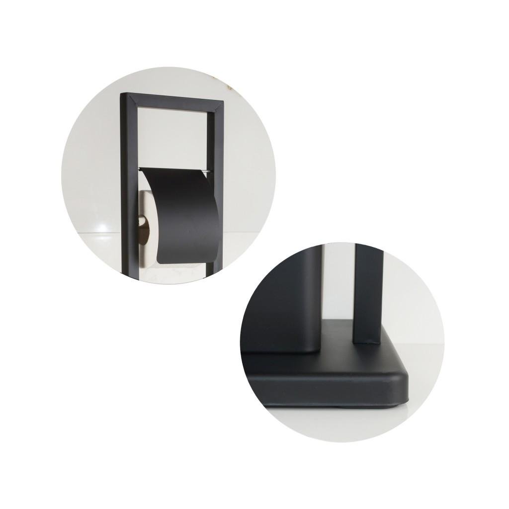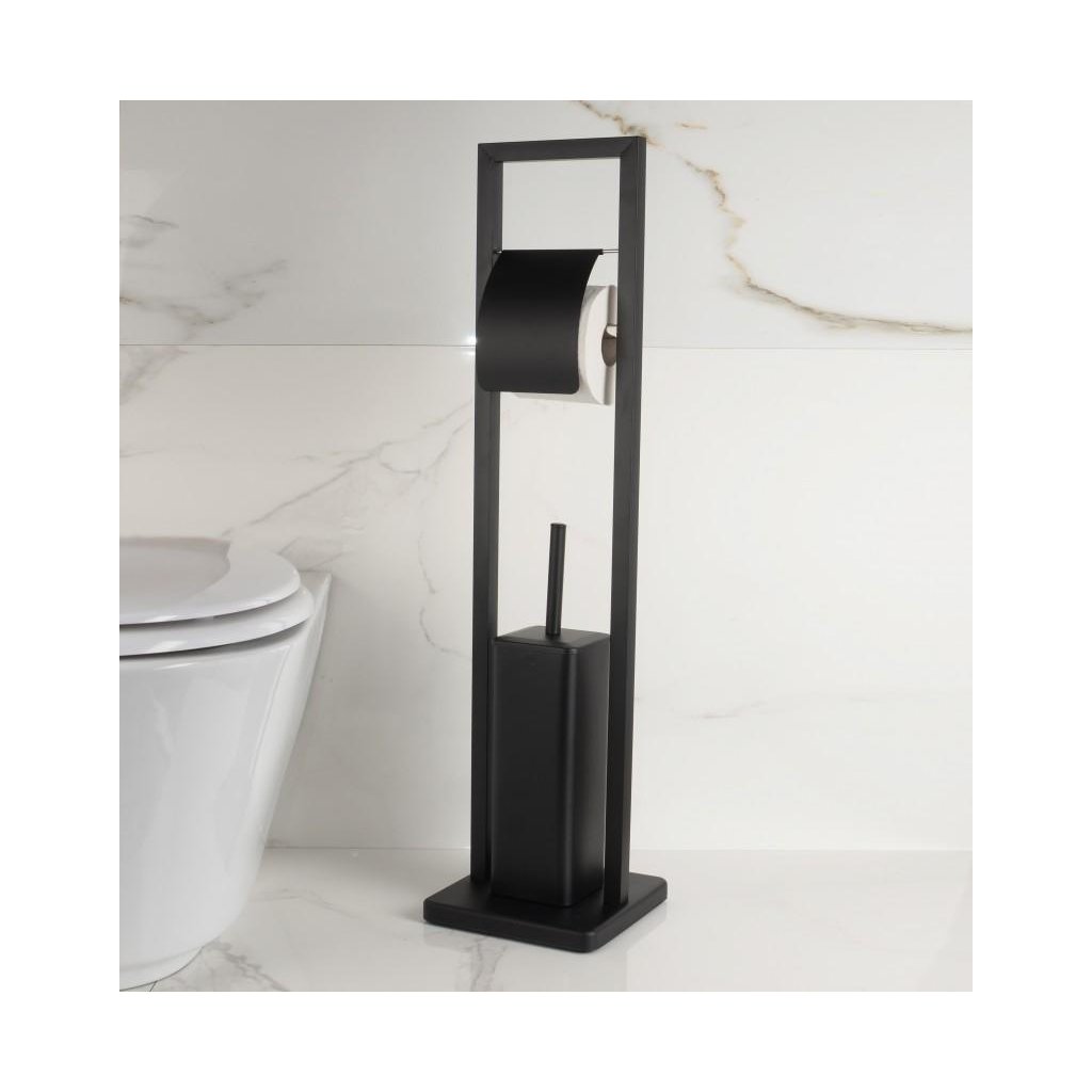 WC stojan s toaletním kartáčem a držákem na toaletní papír s chlopní. Vyrobeno z vysoce kvalitní černé oceli s práškovým nástřikem. WC kartáč má plastovou nádobu, která chrání před rzí a usnadňuje čištění. Protiskluzová základna dodává stojanu velkou stabilitu.