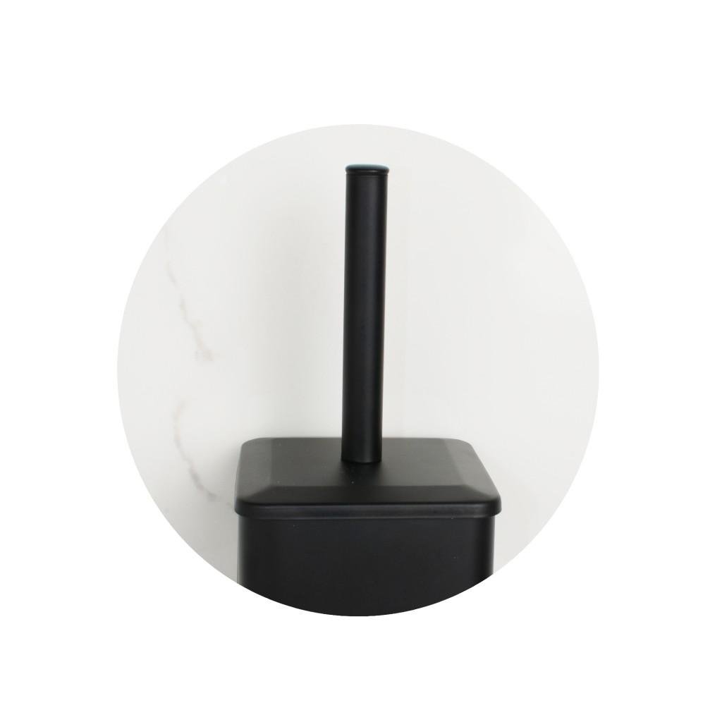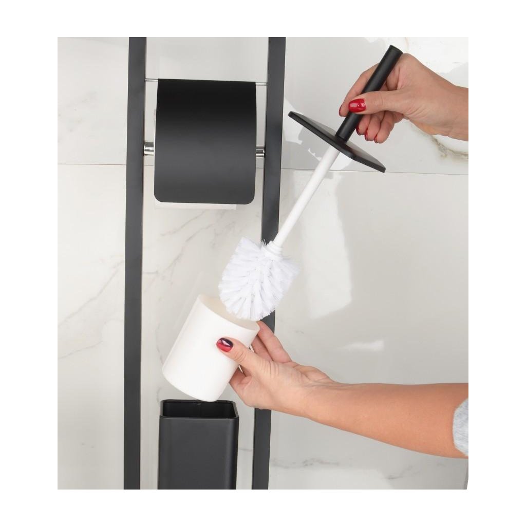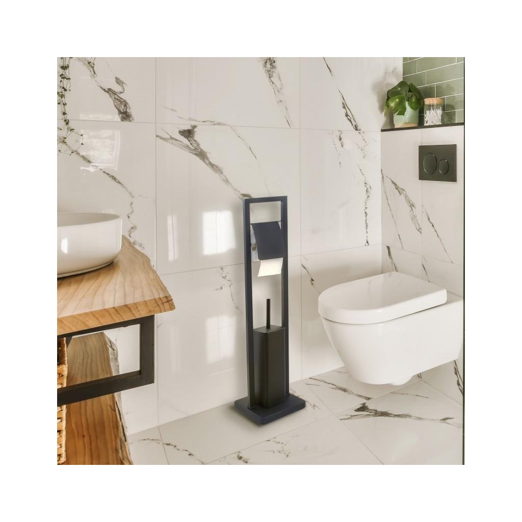 WC stojan s toaletním kartáčem a držákem na toaletní papír s chlopní. Vyrobeno z vysoce kvalitní černé oceli s práškovým nástřikem. WC kartáč má plastovou nádobu, která chrání před rzí a usnadňuje čištění. Protiskluzová základna dodává stojanu velkou stabilitu.