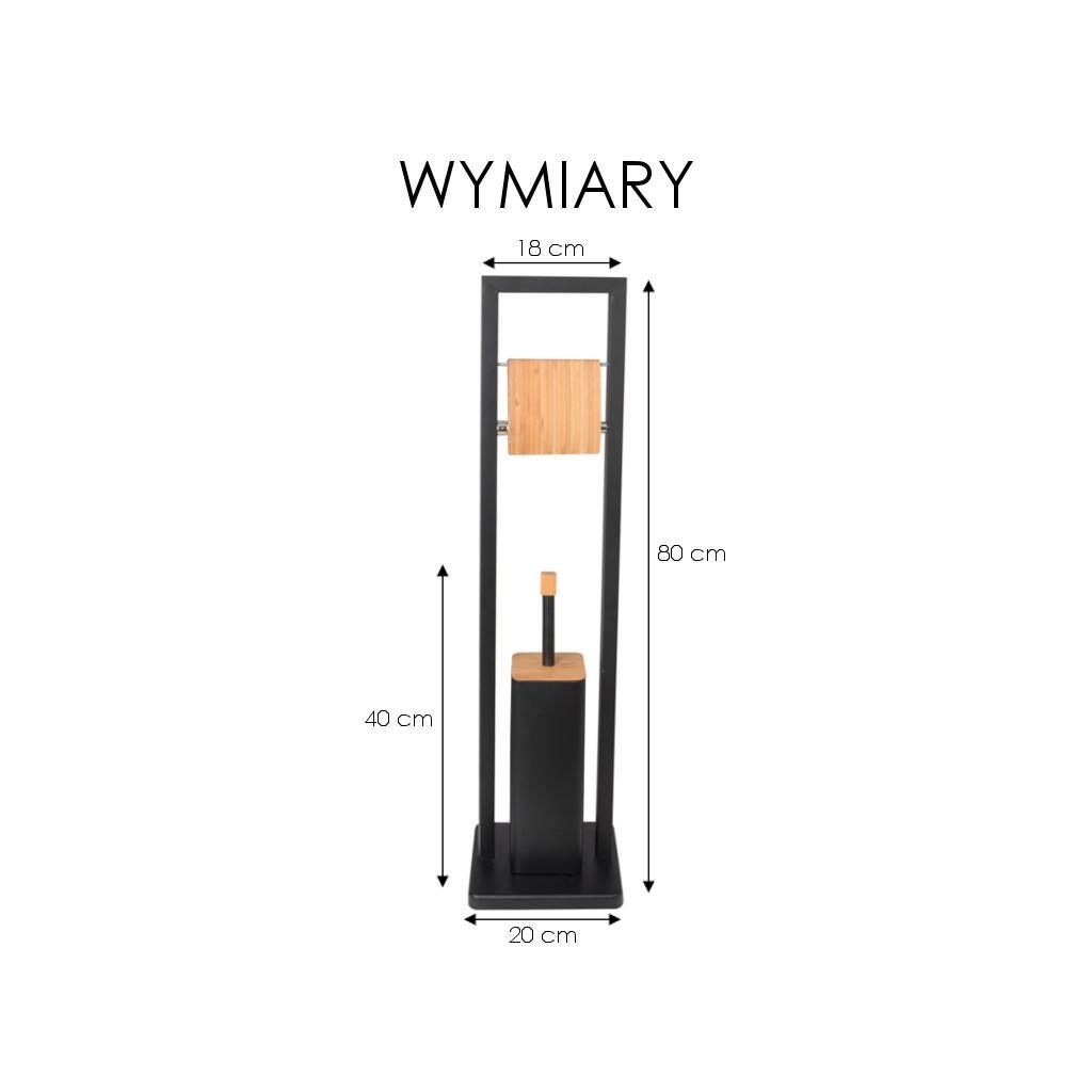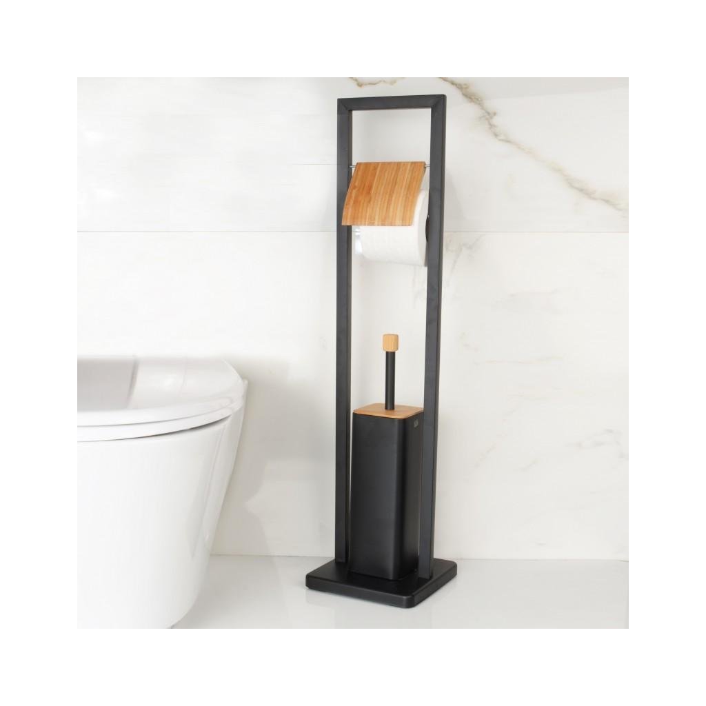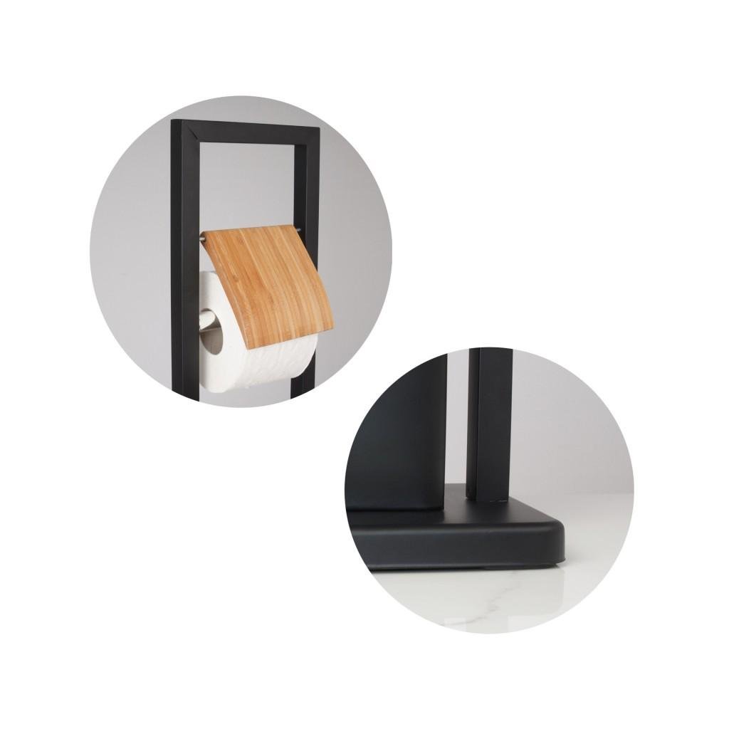 WC stojan s toaletním kartáčem a držákem na toaletní papír s chlopní. Vyrobeno z vysoce kvalitní černé oceli s práškovým nástřikem. Detaily jsou vyrobeny z přírodního bambusového dřeva odolného vůči vlhkosti. WC kartáč má plastovou nádobu, která chrání před rzí a usnadňuje čištění. Protiskluzová základna dodává stojanu velkou stabilitu.