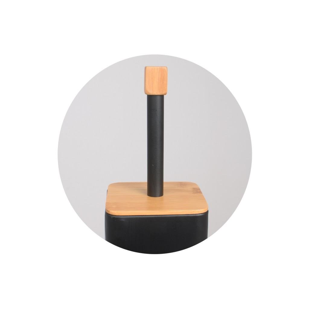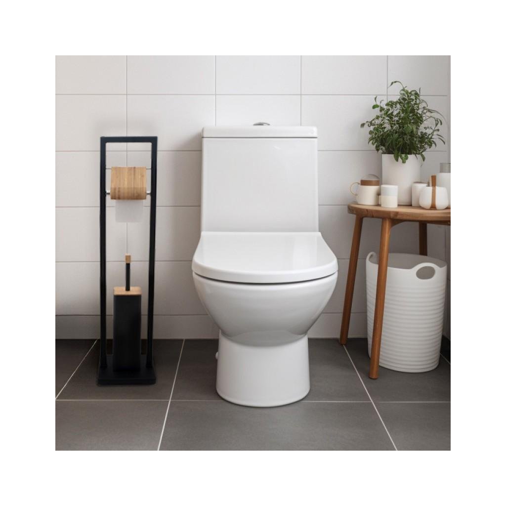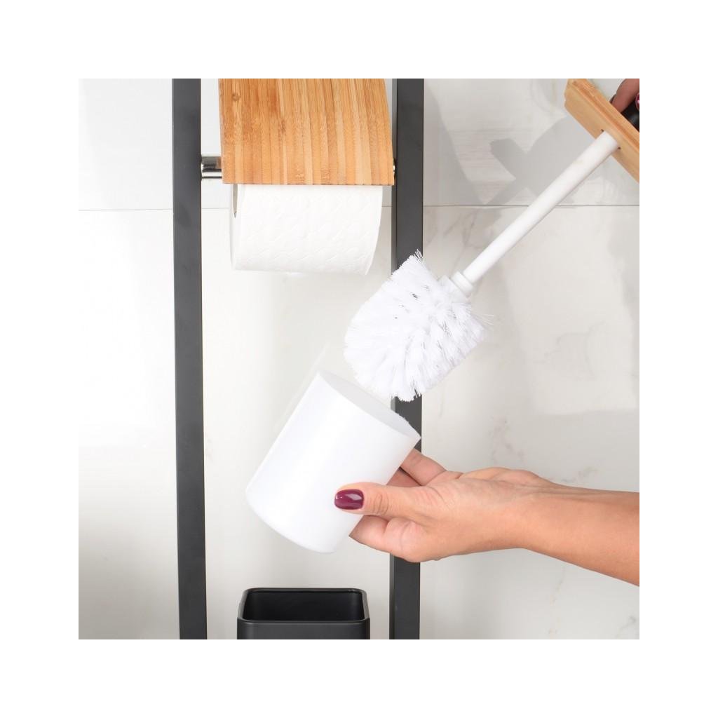 WC stojan s toaletním kartáčem a držákem na toaletní papír s chlopní. Vyrobeno z vysoce kvalitní černé oceli s práškovým nástřikem. Detaily jsou vyrobeny z přírodního bambusového dřeva odolného vůči vlhkosti. WC kartáč má plastovou nádobu, která chrání před rzí a usnadňuje čištění. Protiskluzová základna dodává stojanu velkou stabilitu.