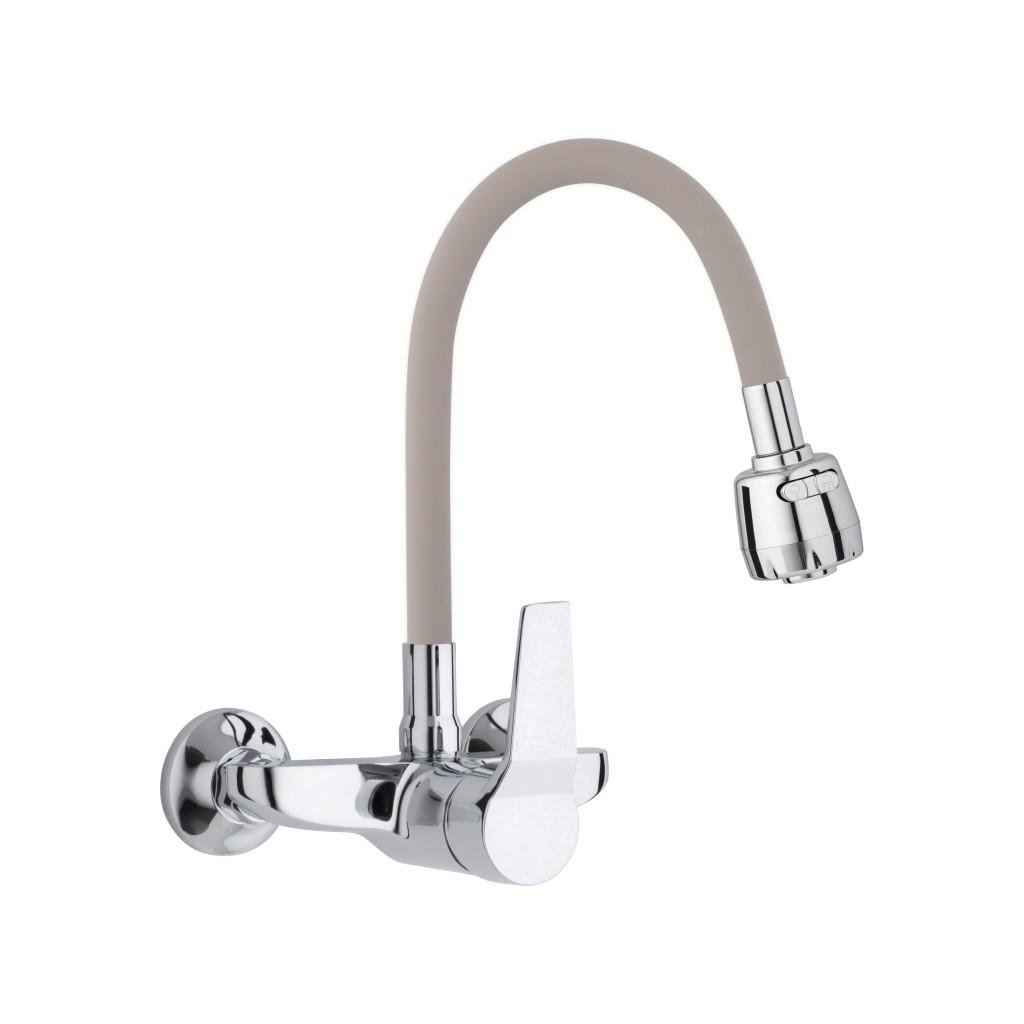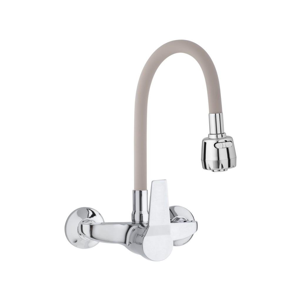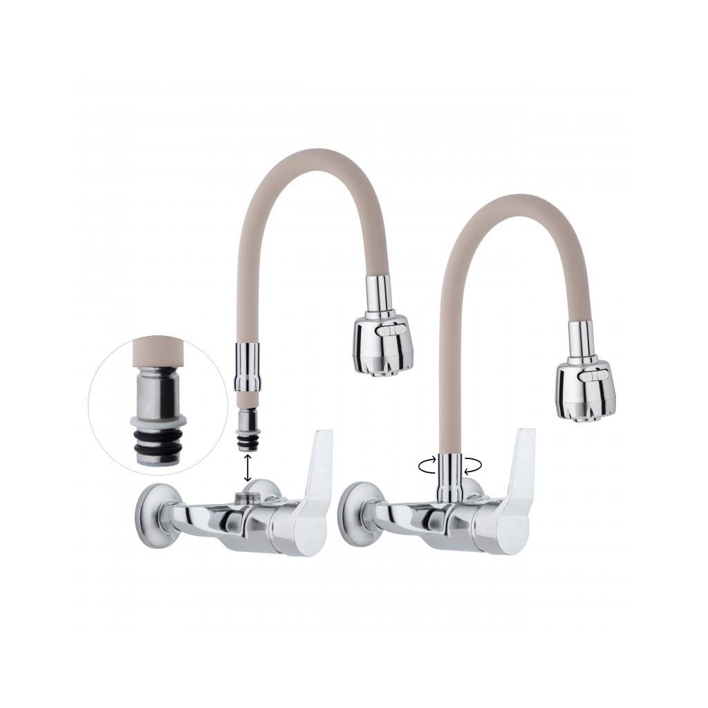 Nástěnná dřezová baterie, jednopáková v béžové barvě. Baterie má dvouproudý výtok, díky kterému můžeme změnit proud vody z klasického na sprchu. Flexibilní výtok je velmi pohodlný a praktický pro každodenní použití – dokonce is velkým umyvadlem se dvěma miskami. Provzdušňovač snižuje spotřebu vody až o 40%.