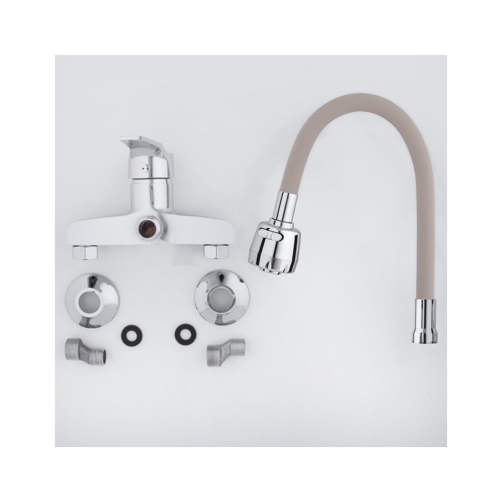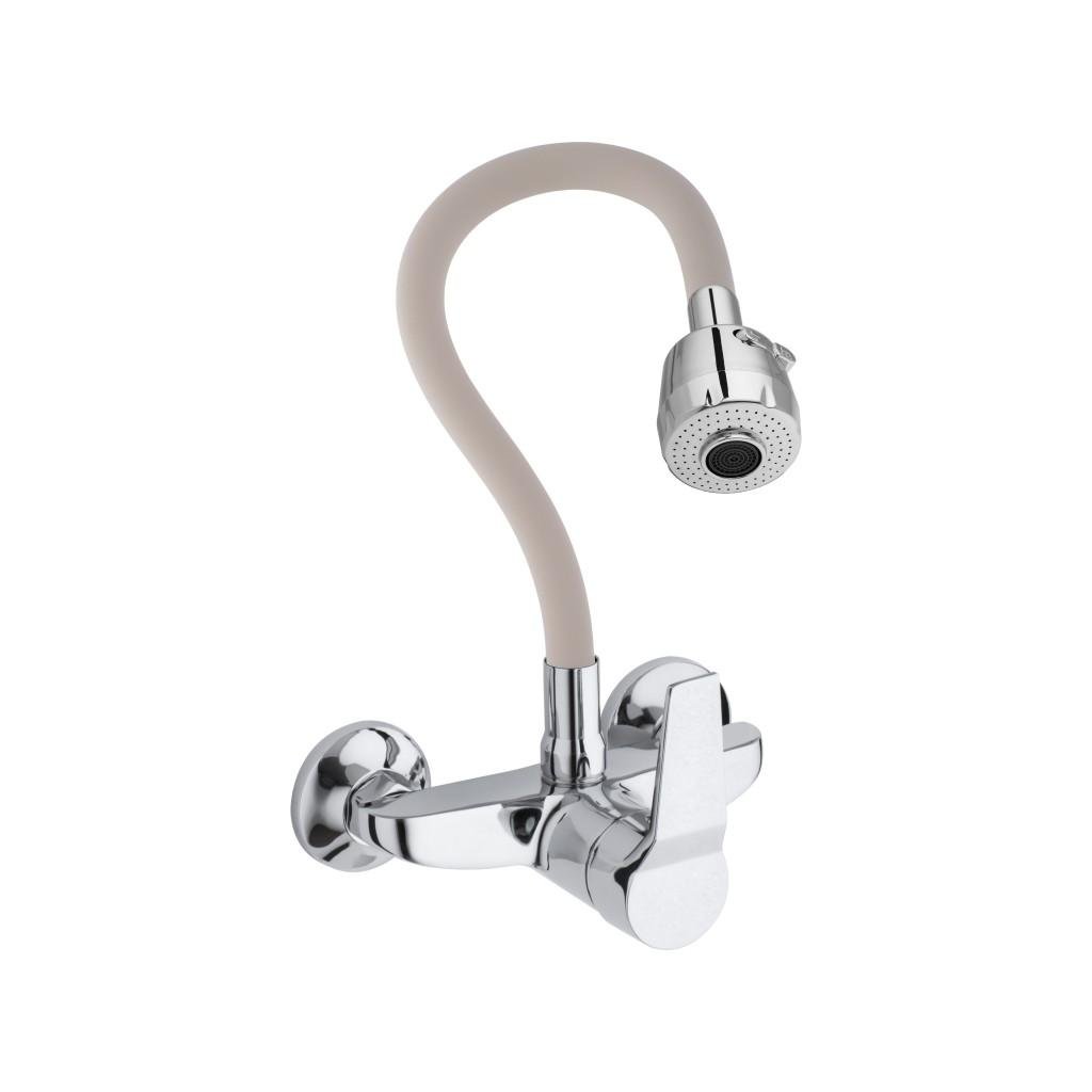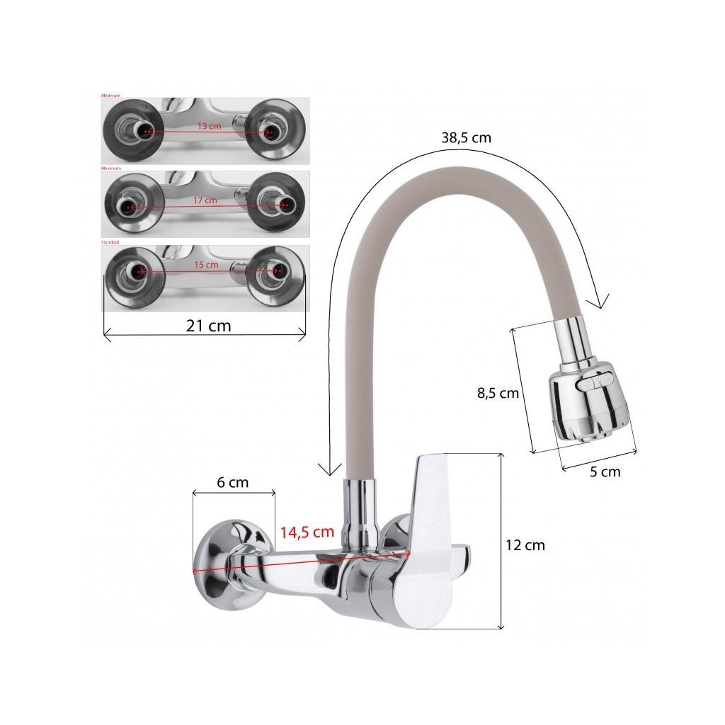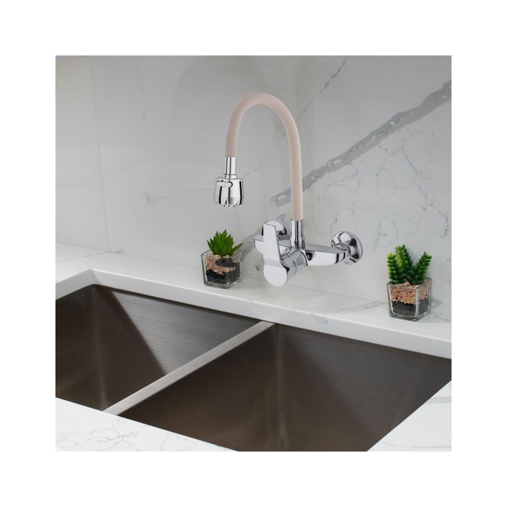 Nástěnná dřezová baterie, jednopáková v béžové barvě. Baterie má dvouproudý výtok, díky kterému můžeme změnit proud vody z klasického na sprchu. Flexibilní výtok je velmi pohodlný a praktický pro každodenní použití – dokonce is velkým umyvadlem se dvěma miskami. Provzdušňovač snižuje spotřebu vody až o 40%.
