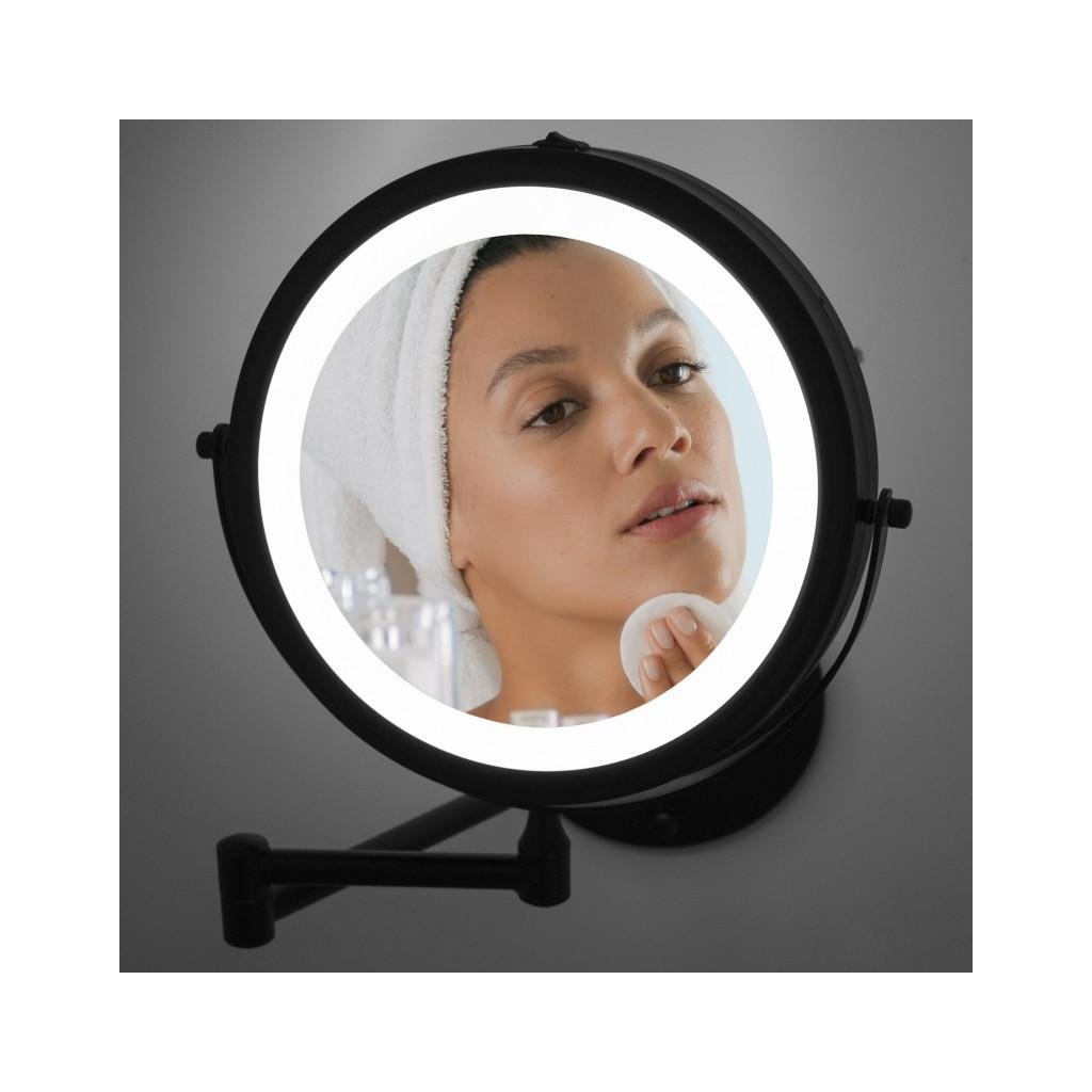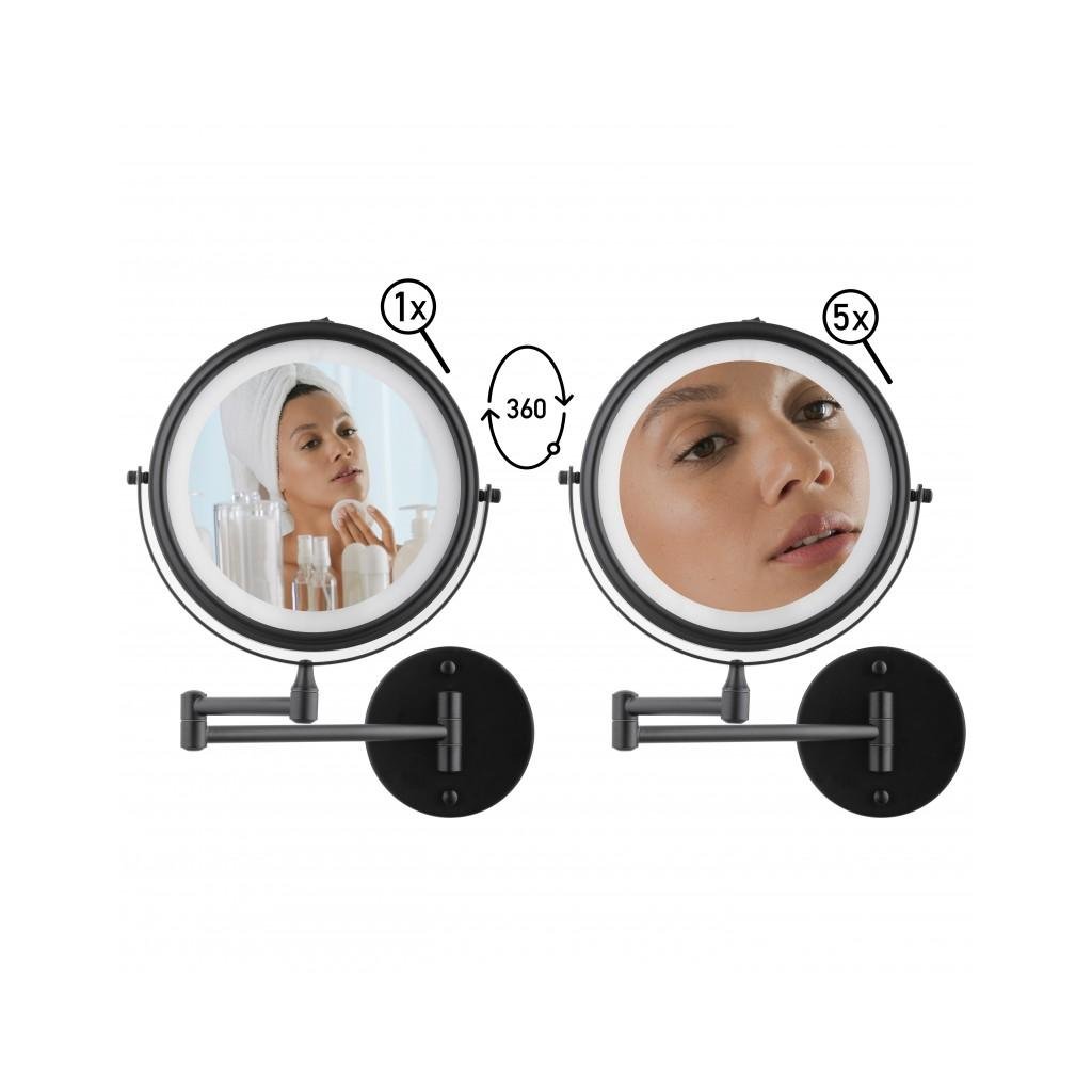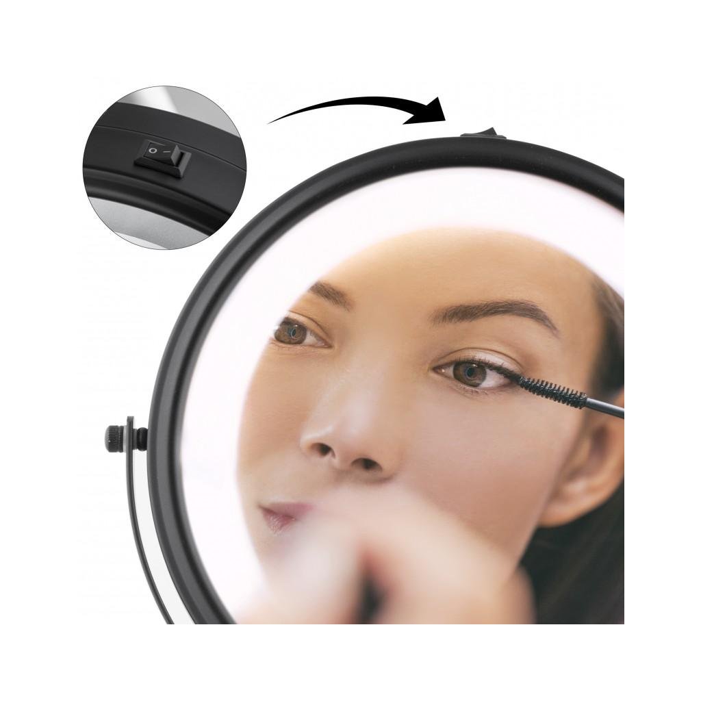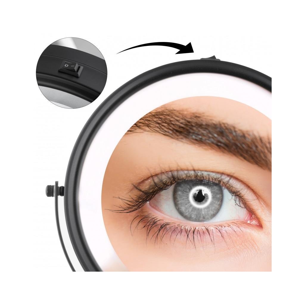 Praktické kulaté LED zrcadlo, užitečné při aplikaci make-upu, úpravě vlasů, holení nebo nasazování kontaktních čoček. Vyrobeno z oceli s nastavením sklonu o 360°, díky čemuž můžeme snadno přizpůsobit jeho uspořádání aktuálním potřebám. Oboustranný: skutečný obraz na jedné straně, zvětšující obraz na druhé straně (x5). Podsvícení se aktivuje vypínačem ON/OFF, který je umístěn na krytu. Má dvoudílné teleskopické rameno, přes které lze volně vysunout a nastavit v pravém úhlu. Vyznačuje se nejen atraktivním vzhledem, ale také praktičností, takže to bude zajímavý a užitečný doplněk, který zpestří vaši koupelnu.