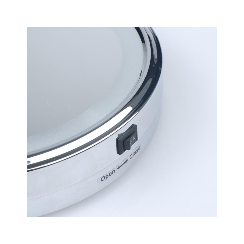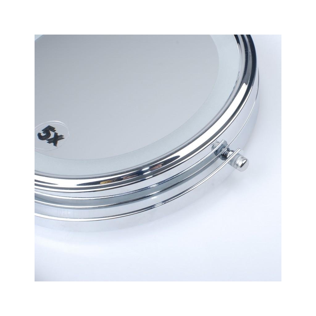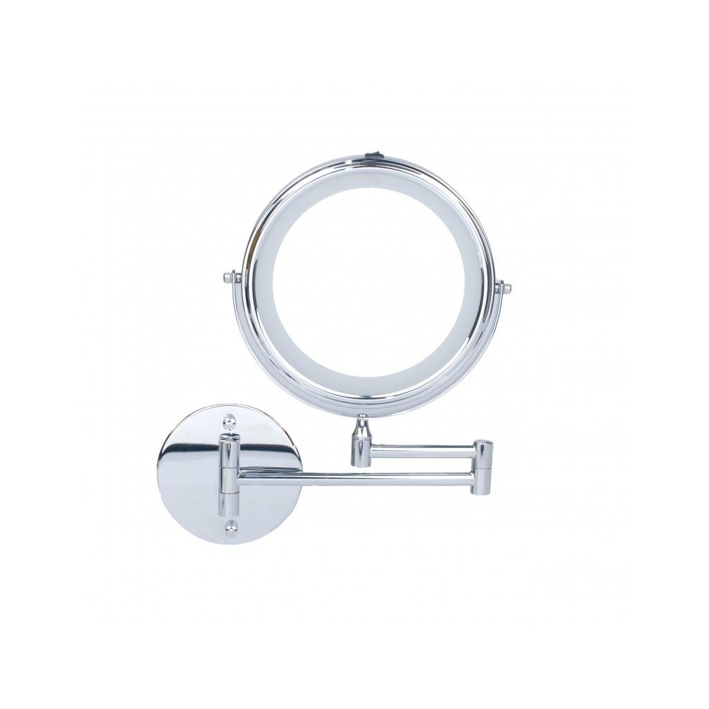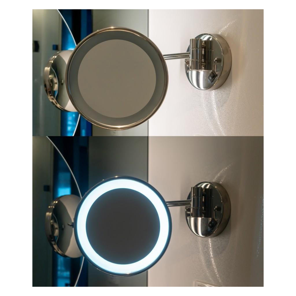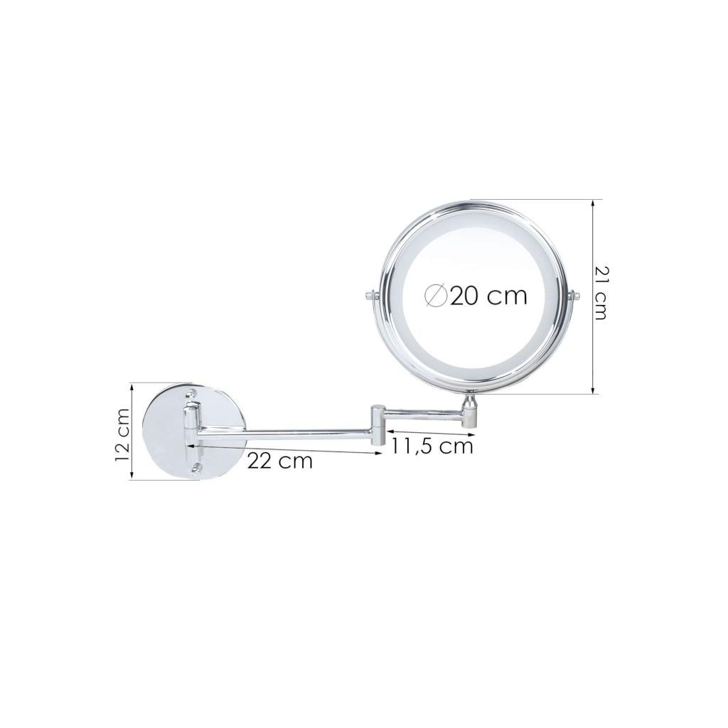Praktické kulaté LED zrcadlo, užitečné při aplikaci make-upu, úpravě vlasů, holení nebo nasazování kontaktních čoček. Vyrobeno z chromované oceli s nastavením sklonu o 360°, díky čemuž můžeme snadno přizpůsobit jeho uspořádání aktuálním potřebám. Oboustranný: skutečný obraz na jedné straně, zvětšující obraz na druhé straně (x5). Podsvícení se aktivuje vypínačem ON/OFF, který je umístěn na krytu. Má dvoudílné teleskopické rameno, přes které lze volně vysunout a nastavit v pravém úhlu. Vyznačuje se nejen atraktivním vzhledem, ale také praktičností, takže to bude zajímavý a užitečný doplněk, který zpestří vaši koupelnu.
