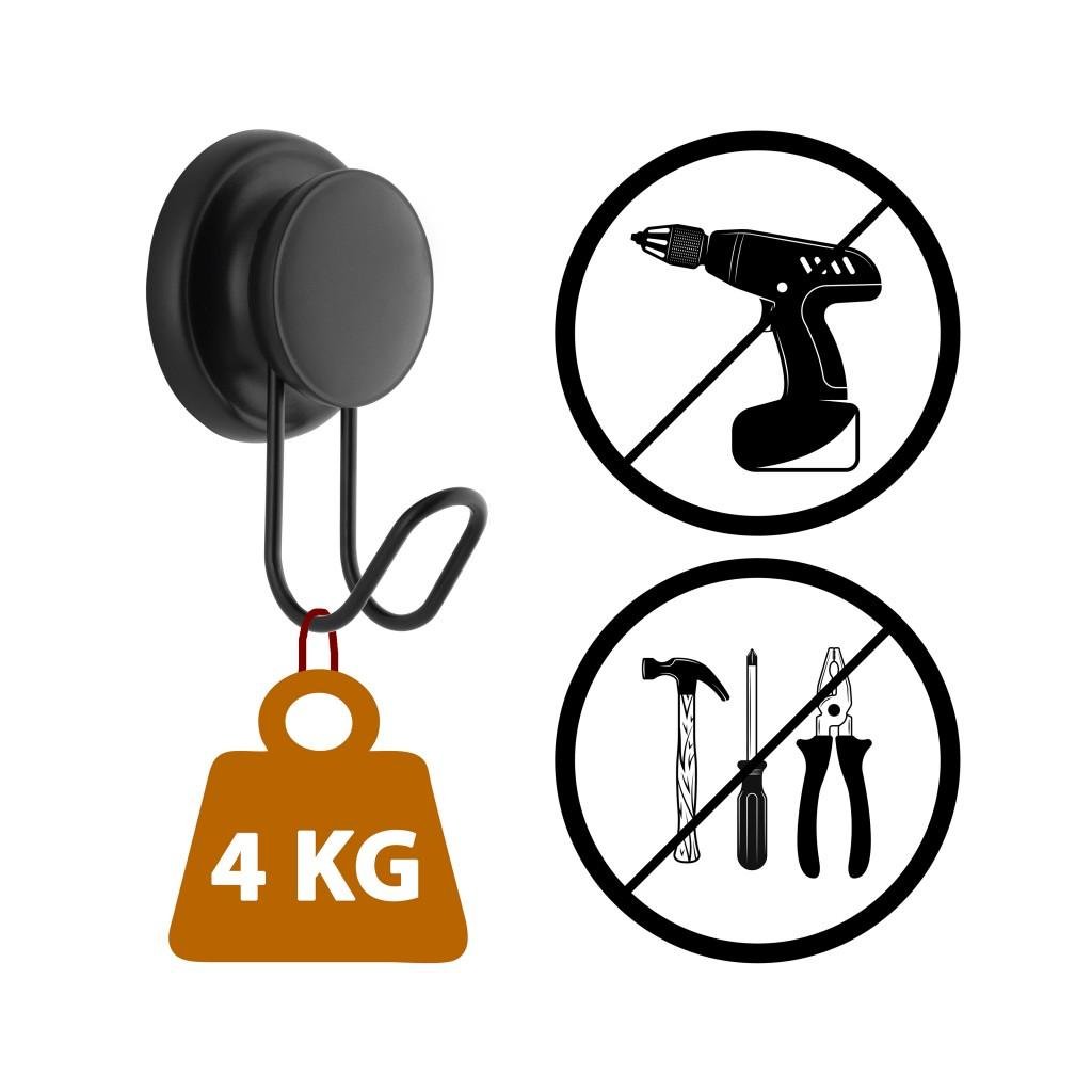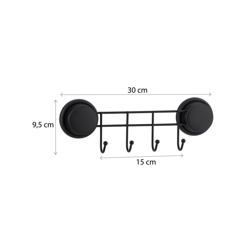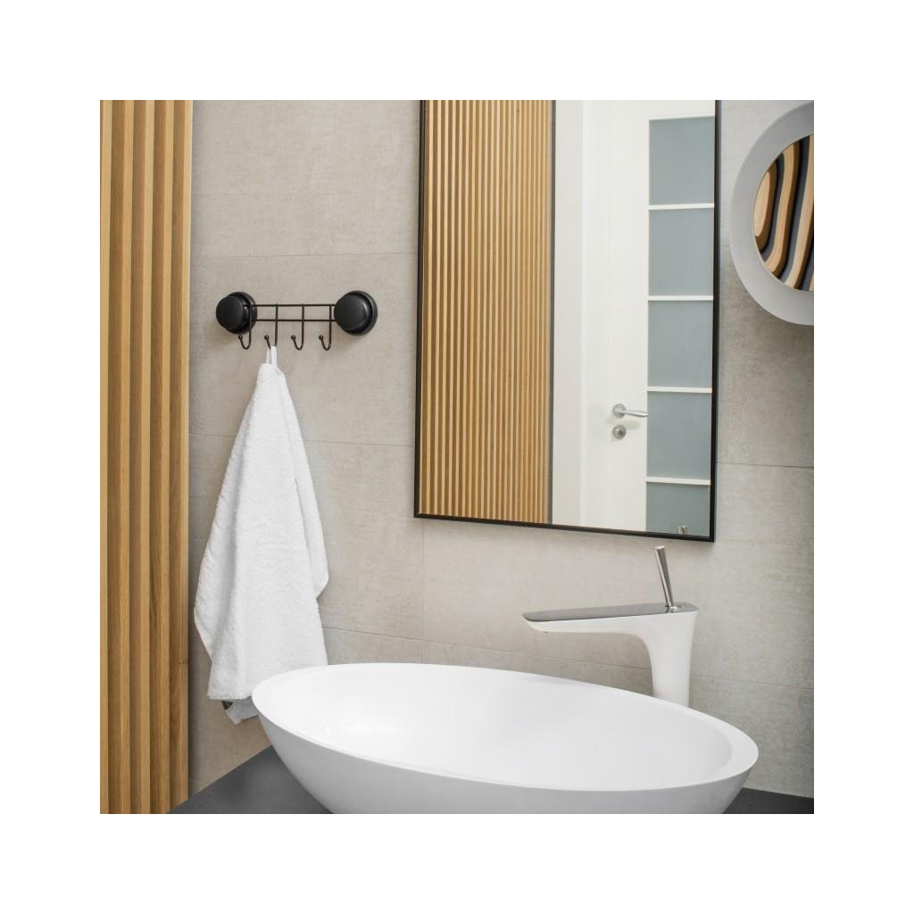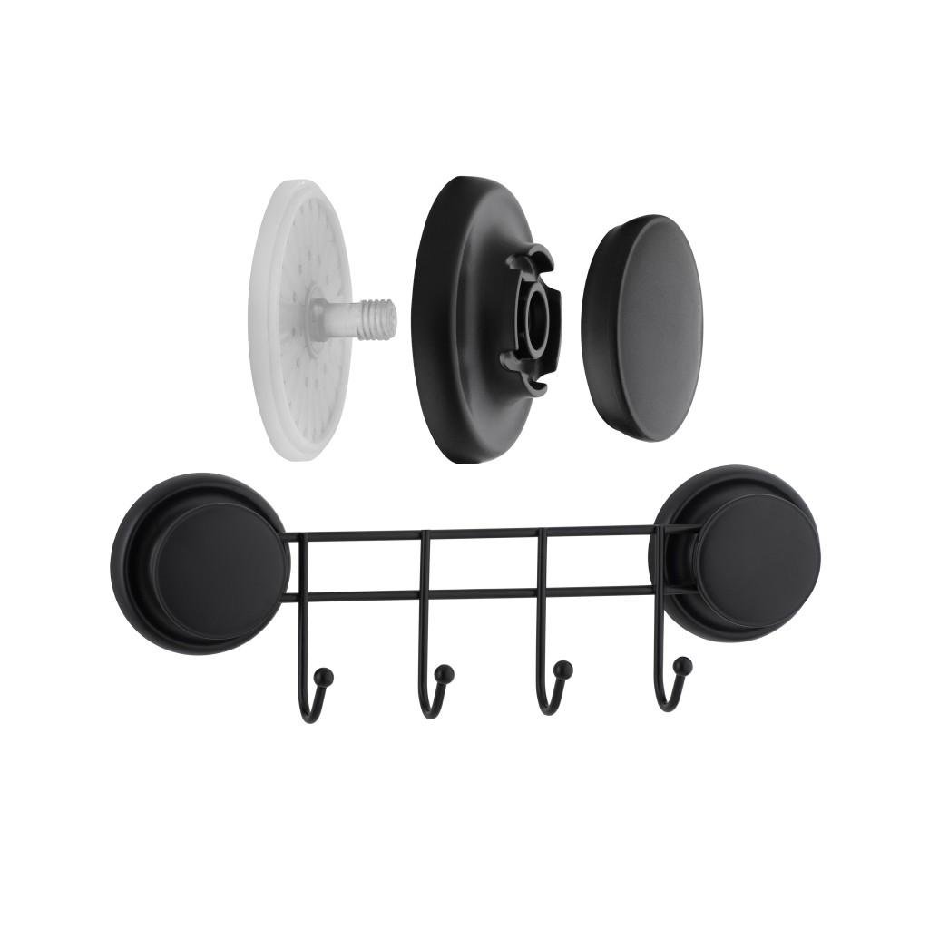 Koupelnový věšák se čtyřmi háčky připevněnými ke stěně se silnou přísavkou. Vlastností, která odlišuje přísavku, je její účinnost na matnou porcelánovou kameninu. Jeho struktura připomíná velmi hustý gel, a tak těsně proniká do porézních povrchů. Je účinný také na dlaždice, lamináty, chladničky, sklo a jiné hladké povrchy. Zaručuje rychlou, jednoduchou a bezpečnou instalaci. Není třeba žádné vrtání ani lepení. Demontáž nezanechává žádné stopy.