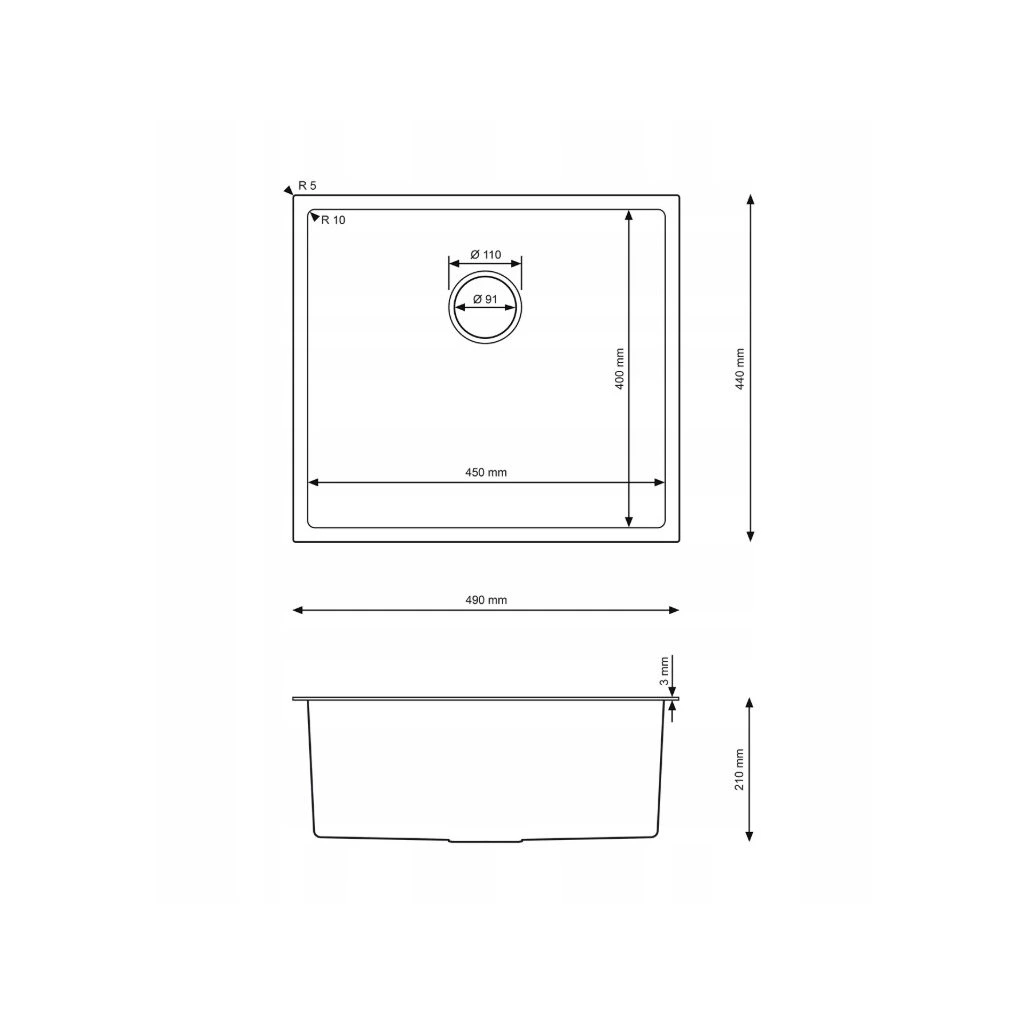 - Rozměry kuchyňského dřezu: 490 mm x 440 mm x 210 mm