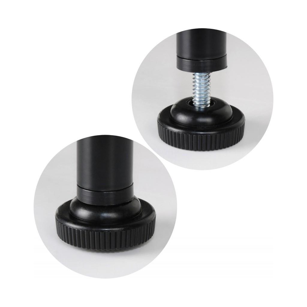 - Regál má čtyři volně nastavitelné stabilizační nohy (nastavení výšky vytočením)