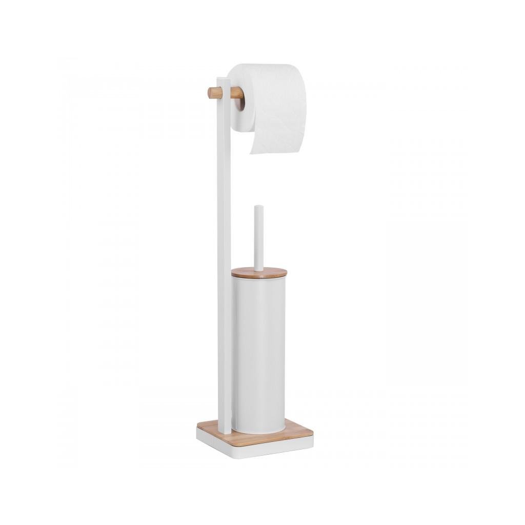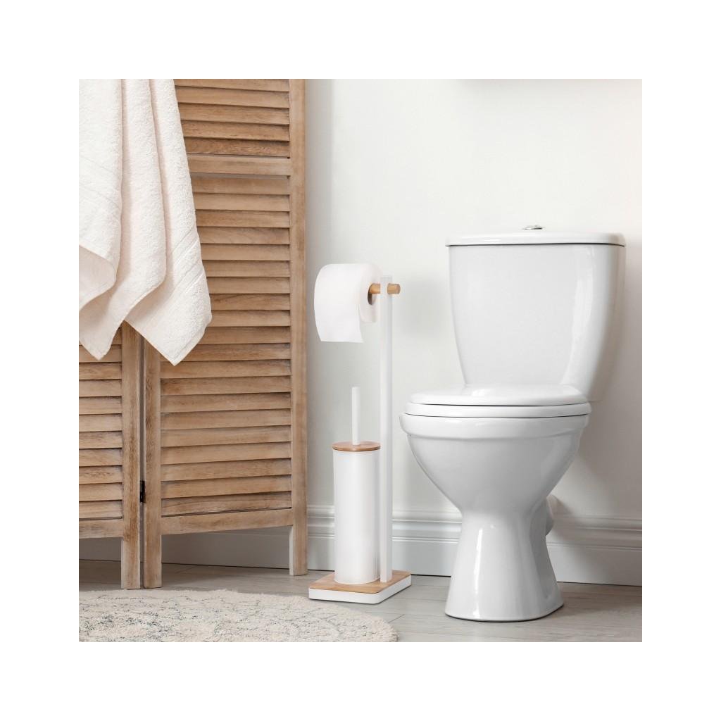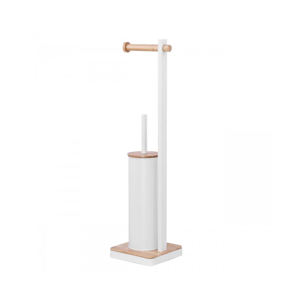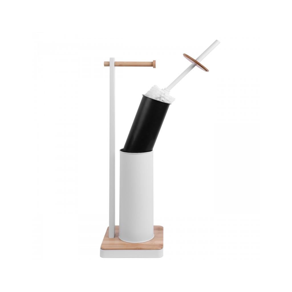 Volně stojící toaletní kartáč s integrovaným držákem toaletního papíru. Stojan je vyroben z kvalitní oceli lakované bílou barvou. Podstavec a držák papíru vyrobený z přírodního bambusového dřeva. Kartáč má ochrannou plastovou nádobu, která chrání před rzí a usnadňuje její čištění. Široká základna, ukončená rámem z bílé oceli, poskytuje vynikající stabilitu.
