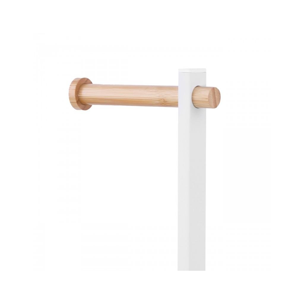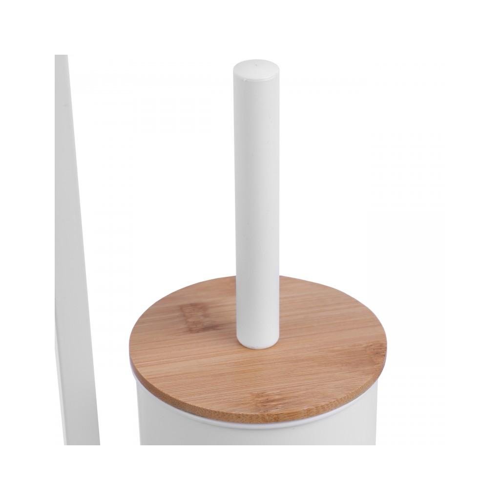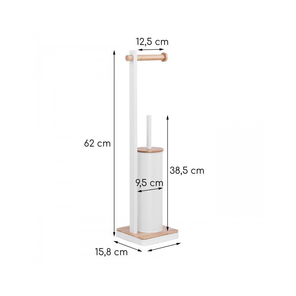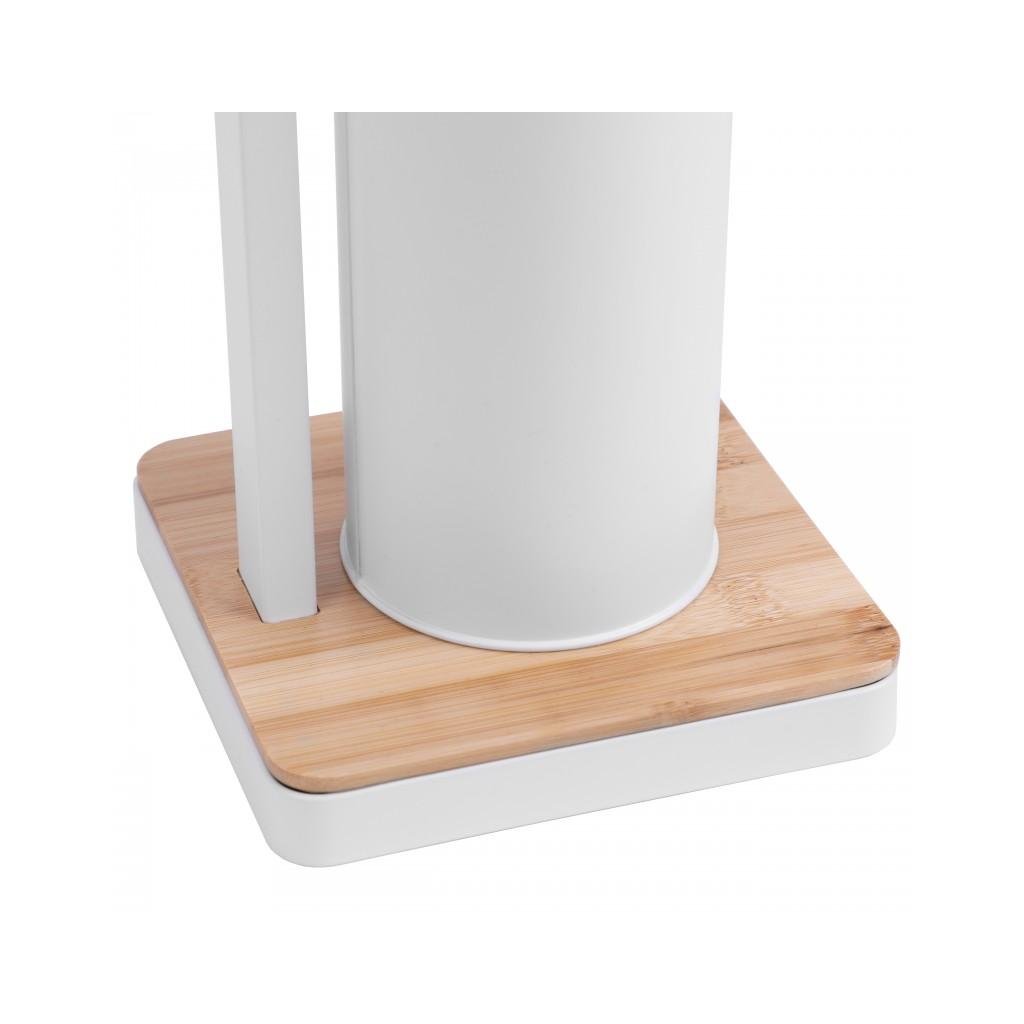 Volně stojící toaletní kartáč s integrovaným držákem toaletního papíru. Stojan je vyroben z kvalitní oceli lakované bílou barvou. Podstavec a držák papíru vyrobený z přírodního bambusového dřeva. Kartáč má ochrannou plastovou nádobu, která chrání před rzí a usnadňuje její čištění. Široká základna, ukončená rámem z bílé oceli, poskytuje vynikající stabilitu.