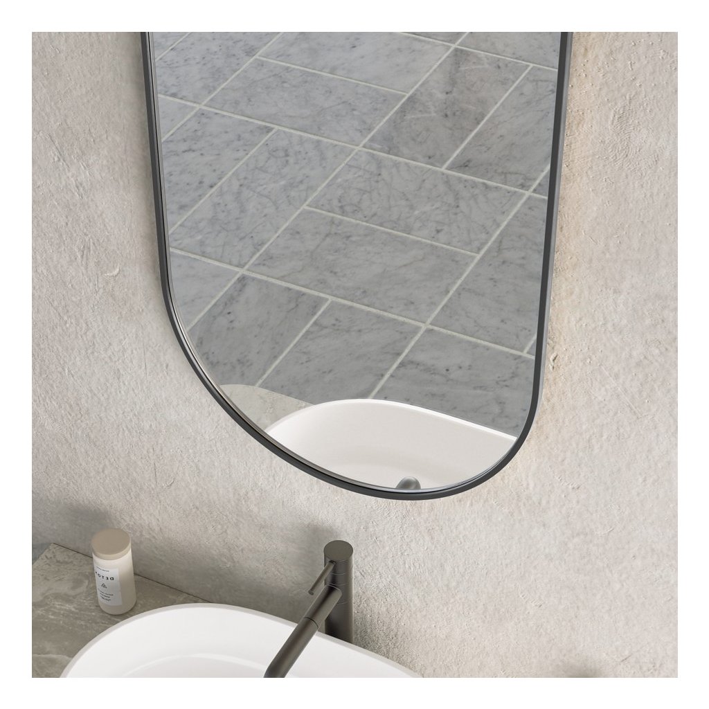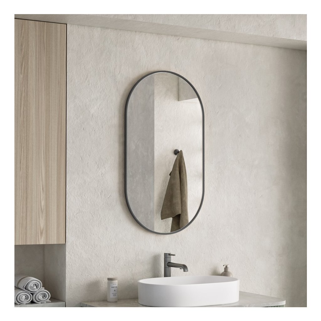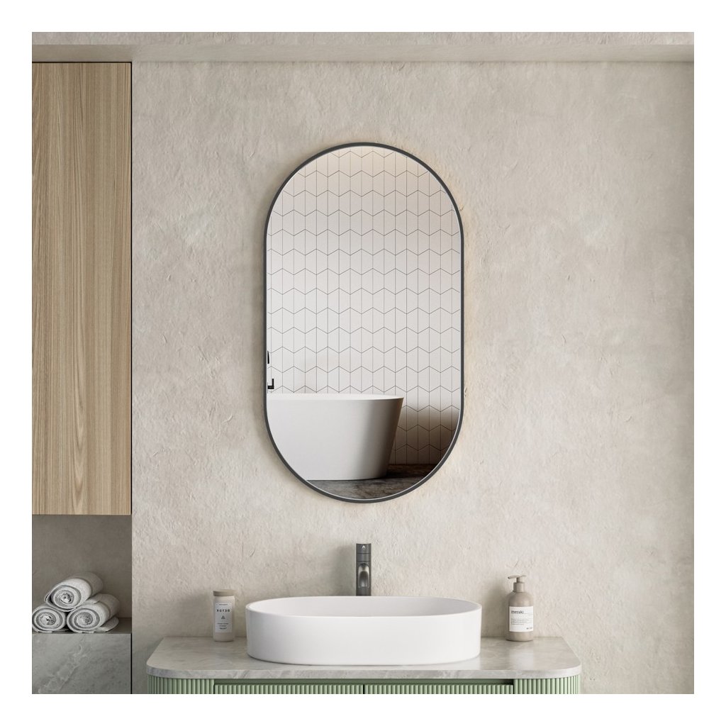![]() | Oválný tvar: Hlavní výhodou oválného zrcadla v koupelně je, že změkčuje vizuální estetiku prostoru a dodává mu organičtější a méně strohý vzhled, zejména ve srovnání s tradičními obdélníkovými nebo čtvercovými zrcadly. Zakřivené okraje pomáhají opticky zvětšit menší koupelny, protože neoddělují stěnu tak ostře jako hranaté rámy. Oválný tvar se hodí k různým stylům interiéru – od moderního minimalismu, přes tradiční až po art deco. Dobře se kombinuje se zaoblenými liniemi ostatního vybavení, jako jsou umyvadla nebo vany | |