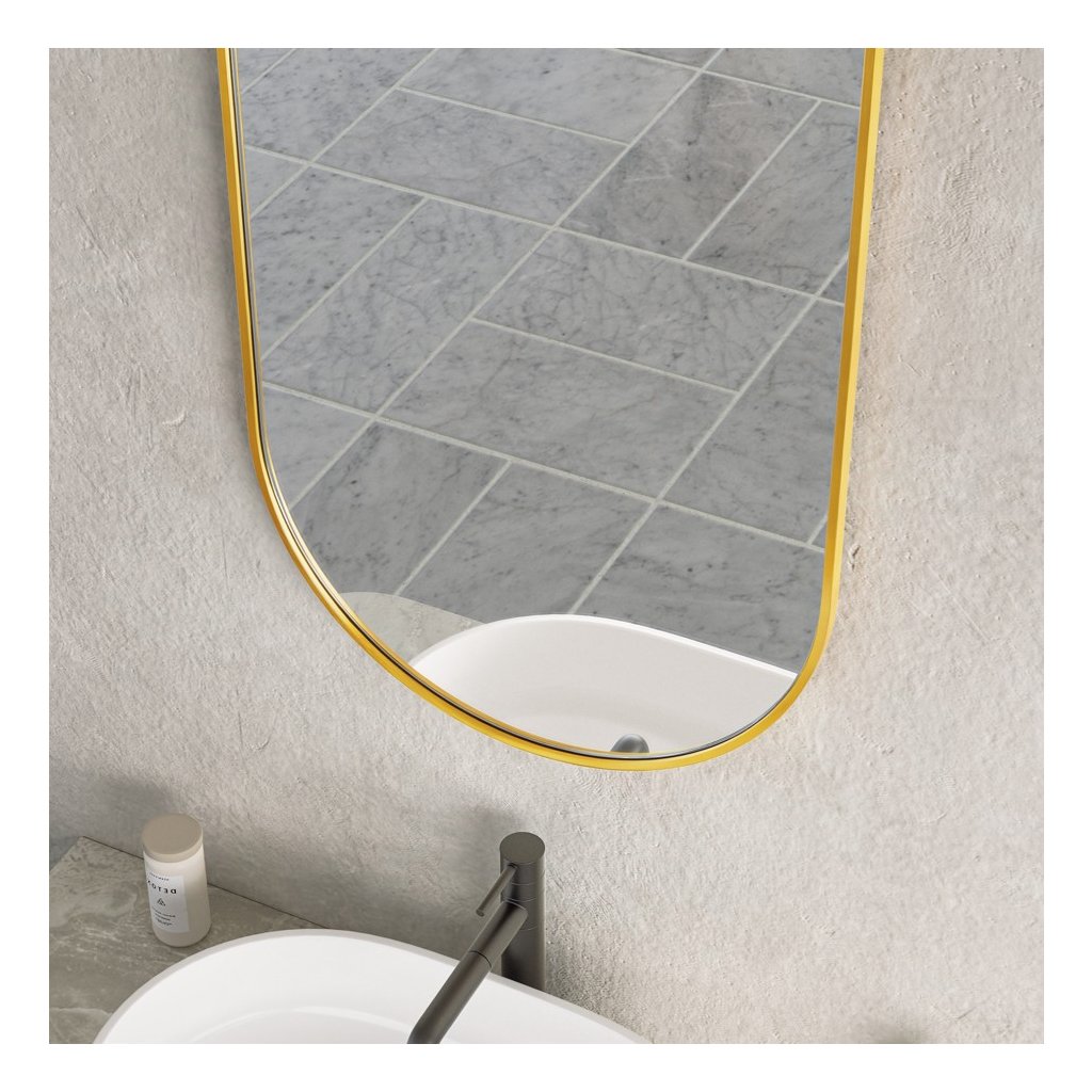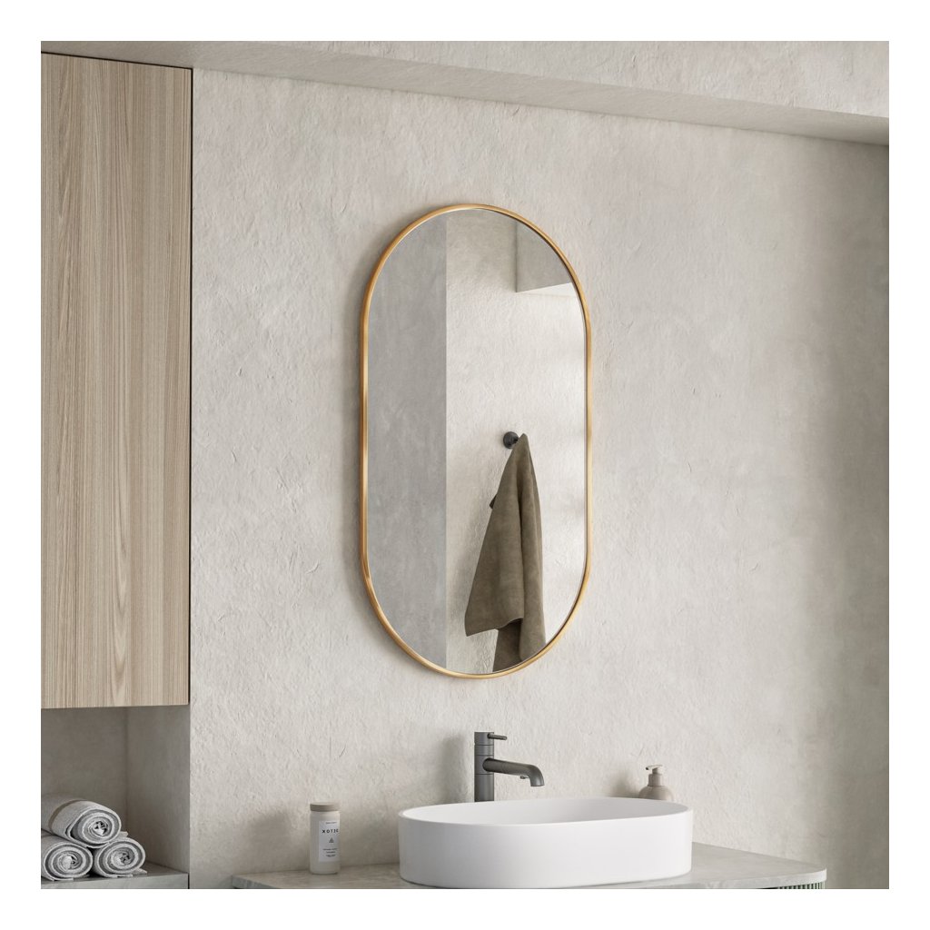 ![]() | Oválný tvar: Hlavní výhodou oválného zrcadla v koupelně je, že změkčuje vizuální estetiku prostoru a dodává mu organičtější a méně strohý vzhled, zejména ve srovnání s tradičními obdélníkovými nebo čtvercovými zrcadly. Zakřivené okraje pomáhají opticky zvětšit menší koupelny, protože neoddělují stěnu tak ostře jako hranaté rámy. Oválný tvar se hodí k různým stylům interiéru – od moderního minimalismu, přes tradiční až po art deco. Dobře se kombinuje se zaoblenými liniemi ostatního vybavení, jako jsou umyvadla nebo vany | |