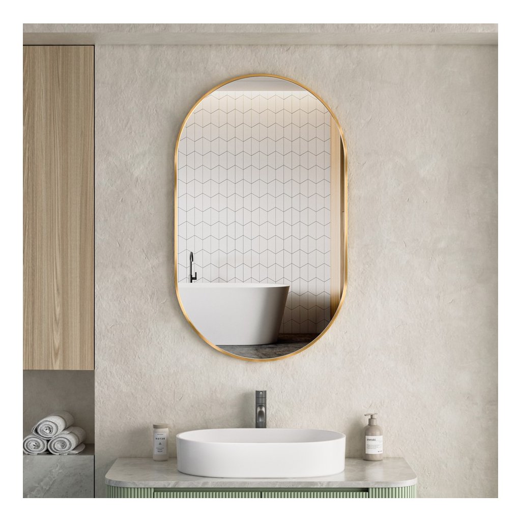 ![]() | Oválný tvar: Hlavní výhodou oválného zrcadla v koupelně je, že změkčuje vizuální estetiku prostoru a dodává mu organičtější a méně strohý vzhled, zejména ve srovnání s tradičními obdélníkovými nebo čtvercovými zrcadly. Zakřivené okraje pomáhají opticky zvětšit menší koupelny, protože neoddělují stěnu tak ostře jako hranaté rámy. Oválný tvar se hodí k různým stylům interiéru – od moderního minimalismu, přes tradiční až po art deco. Dobře se kombinuje se zaoblenými liniemi ostatního vybavení, jako jsou umyvadla nebo vany | |