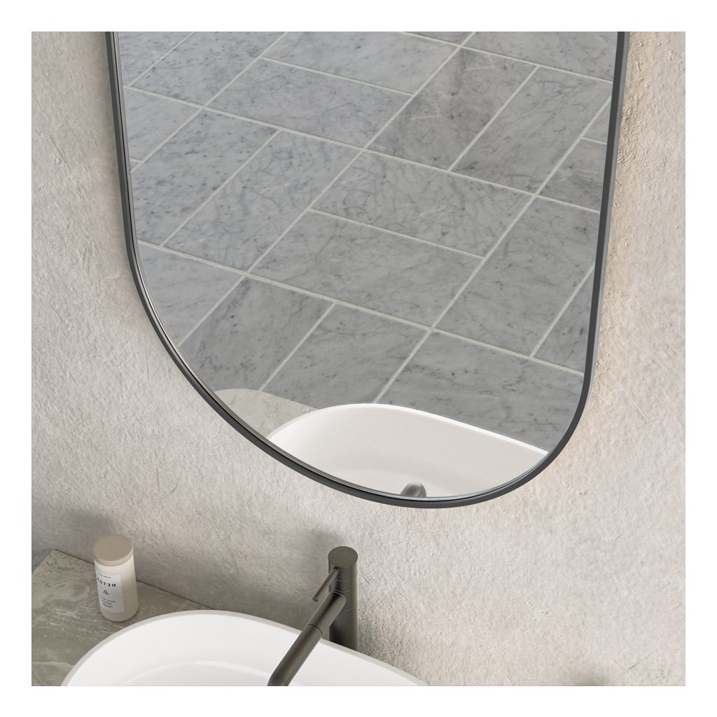 ![]() | Oválný tvar: Hlavní výhodou oválného zrcadla v koupelně je, že změkčuje vizuální estetiku prostoru a dodává mu organičtější a méně strohý vzhled, zejména ve srovnání s tradičními obdélníkovými nebo čtvercovými zrcadly. Zakřivené okraje pomáhají opticky zvětšit menší koupelny, protože neoddělují stěnu tak ostře jako hranaté rámy. Oválný tvar se hodí k různým stylům interiéru – od moderního minimalismu, přes tradiční až po art deco. Dobře se kombinuje se zaoblenými liniemi ostatního vybavení, jako jsou umyvadla nebo vany | |