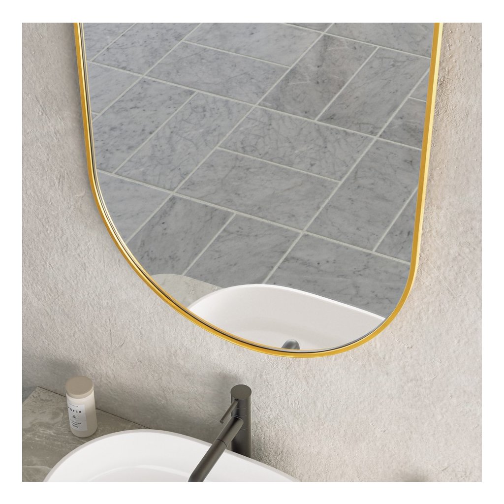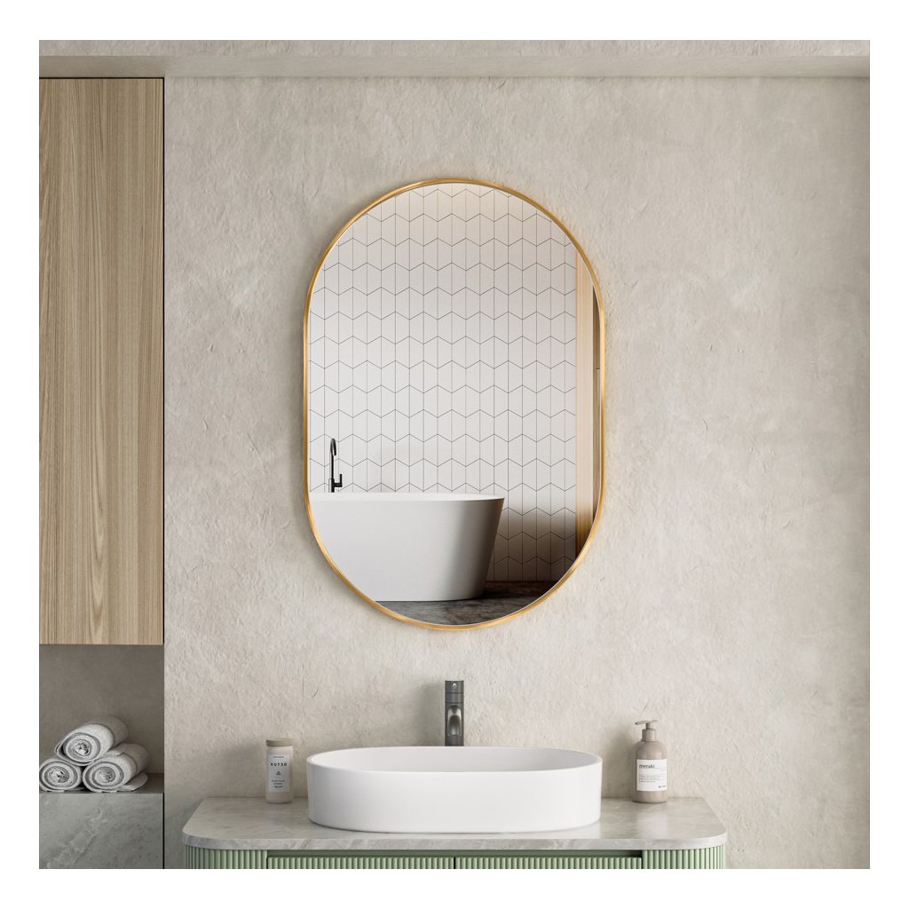 ![]() | Oválný tvar: Hlavní výhodou oválného zrcadla v koupelně je, že změkčuje vizuální estetiku prostoru a dodává mu organičtější a méně strohý vzhled, zejména ve srovnání s tradičními obdélníkovými nebo čtvercovými zrcadly. Zakřivené okraje pomáhají opticky zvětšit menší koupelny, protože neoddělují stěnu tak ostře jako hranaté rámy. Oválný tvar se hodí k různým stylům interiéru – od moderního minimalismu, přes tradiční až po art deco. Dobře se kombinuje se zaoblenými liniemi ostatního vybavení, jako jsou umyvadla nebo vany | |