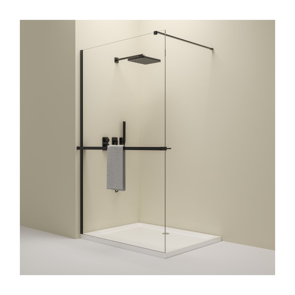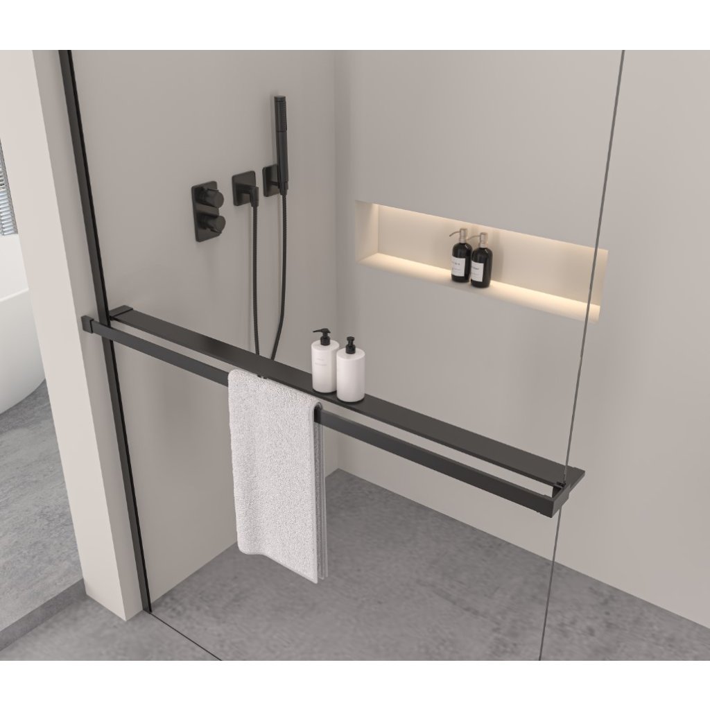 Erga Paris, sprchová zástěna Walk-In 50x200 cm s poličkou a ramínkem na ručníky, 8mm čiré sklo, černý profil, ERG-V02-PARIS-050x200-CL-BK-BAR
