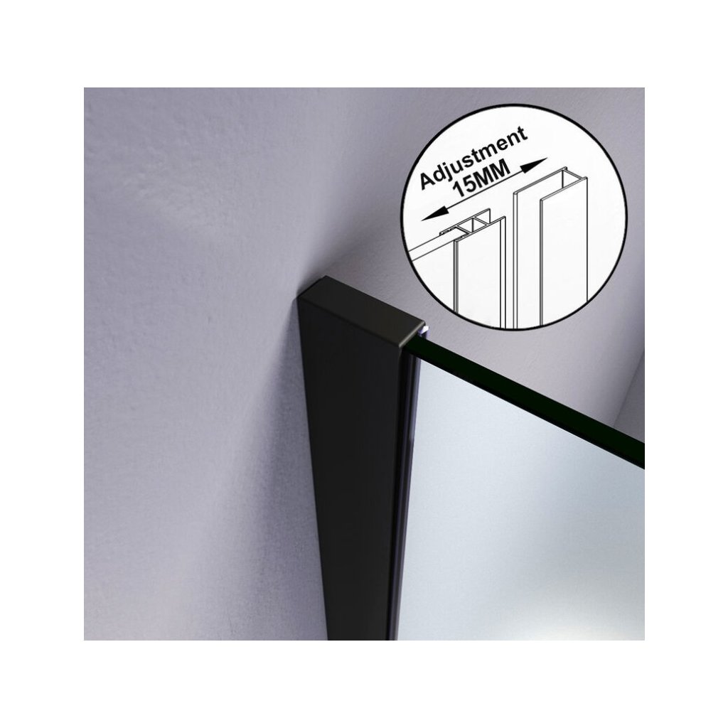 - Typ: sprchová zástěna WALK-IN v černém kovovém rámu.
