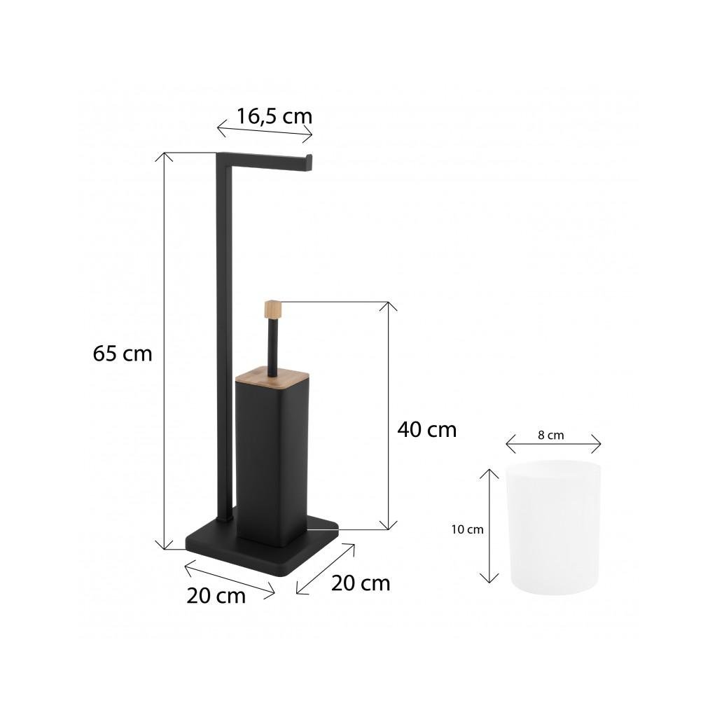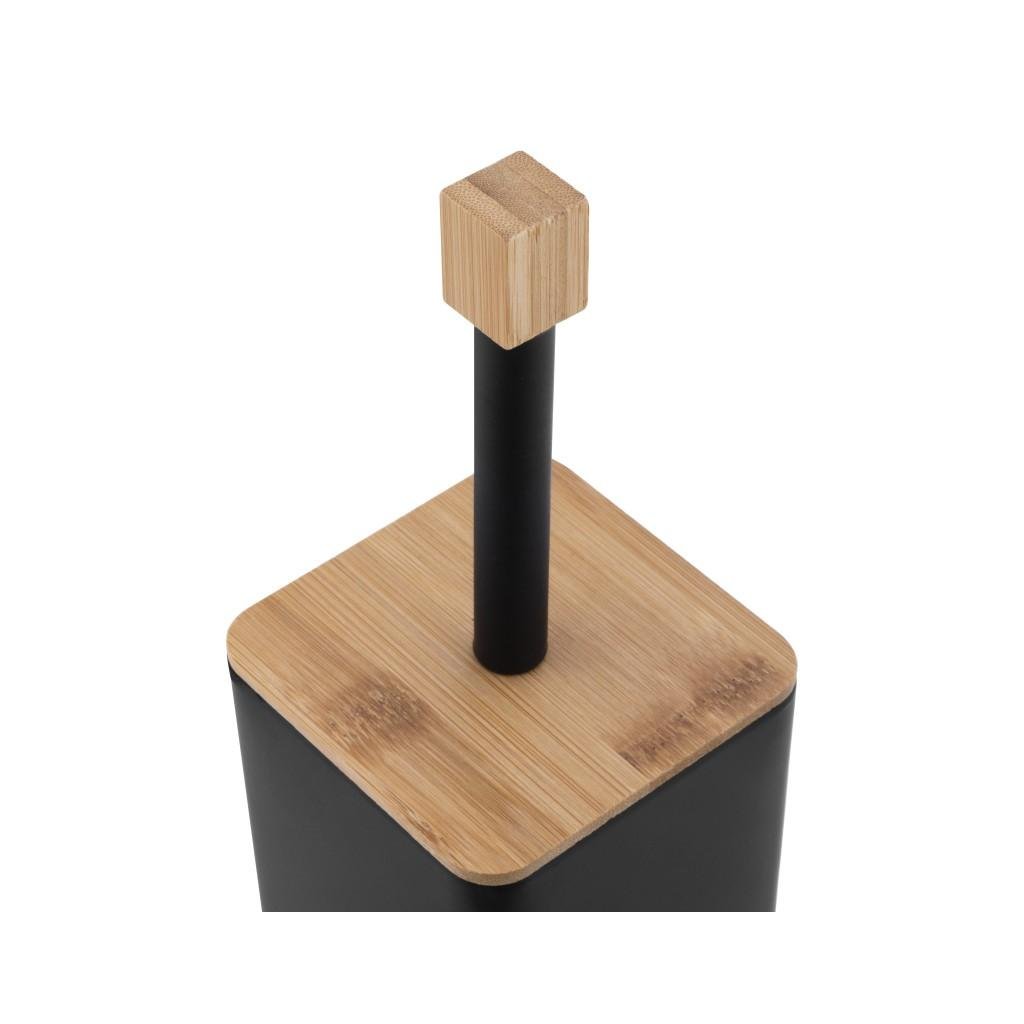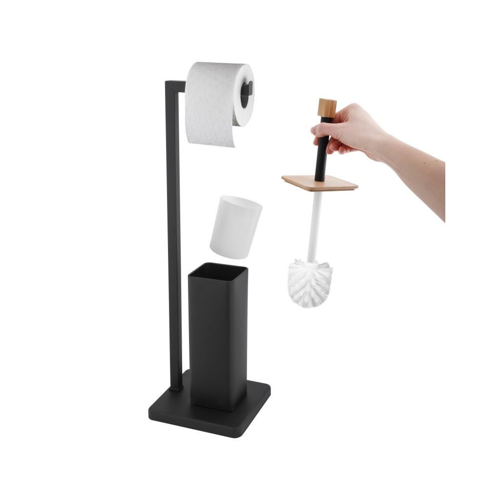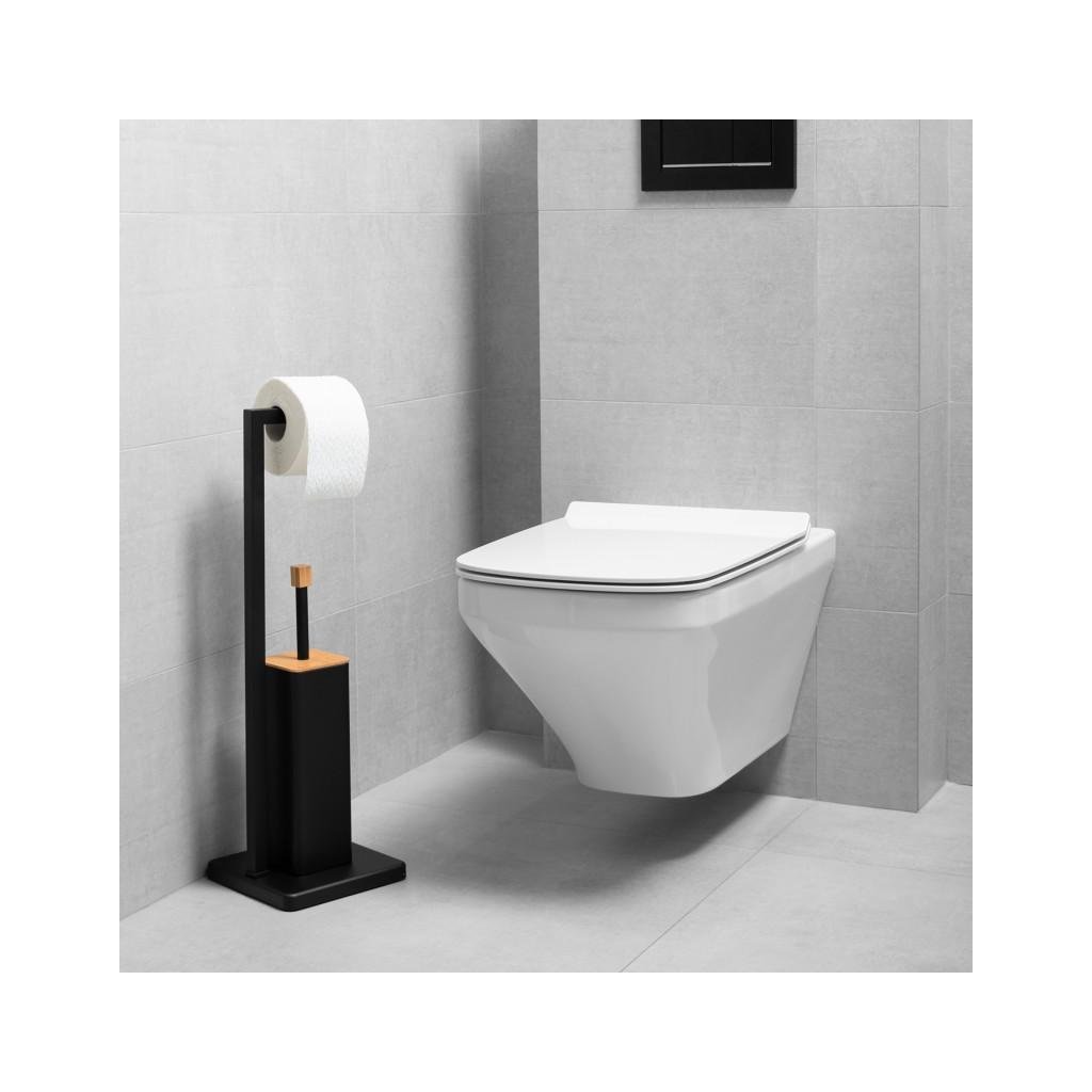 Volně stojící toaletní kartáč s integrovaným držákem toaletního papíru. Stojan je vyroben z kvalitní oceli lakované černou barvou. Kryt kartáče vyrobený z přírodního bambusového dřeva. Kartáč má ochrannou plastovou nádobu, která chrání před rzí a usnadňuje její čištění. Protiskluzová základna dodává stojanu velkou stabilitu.