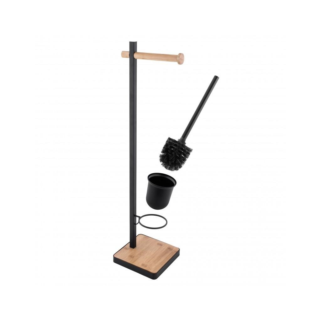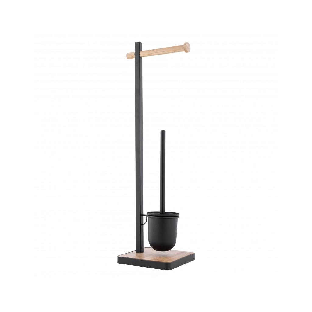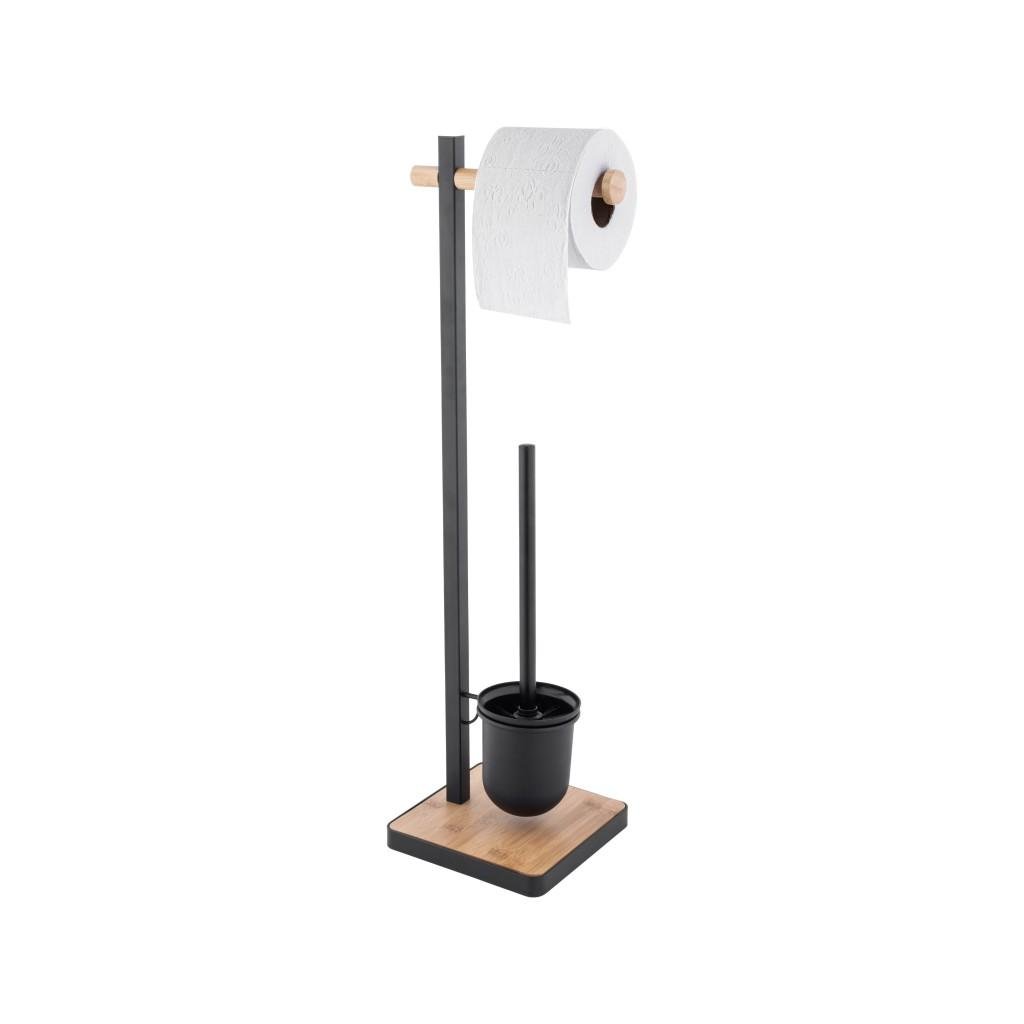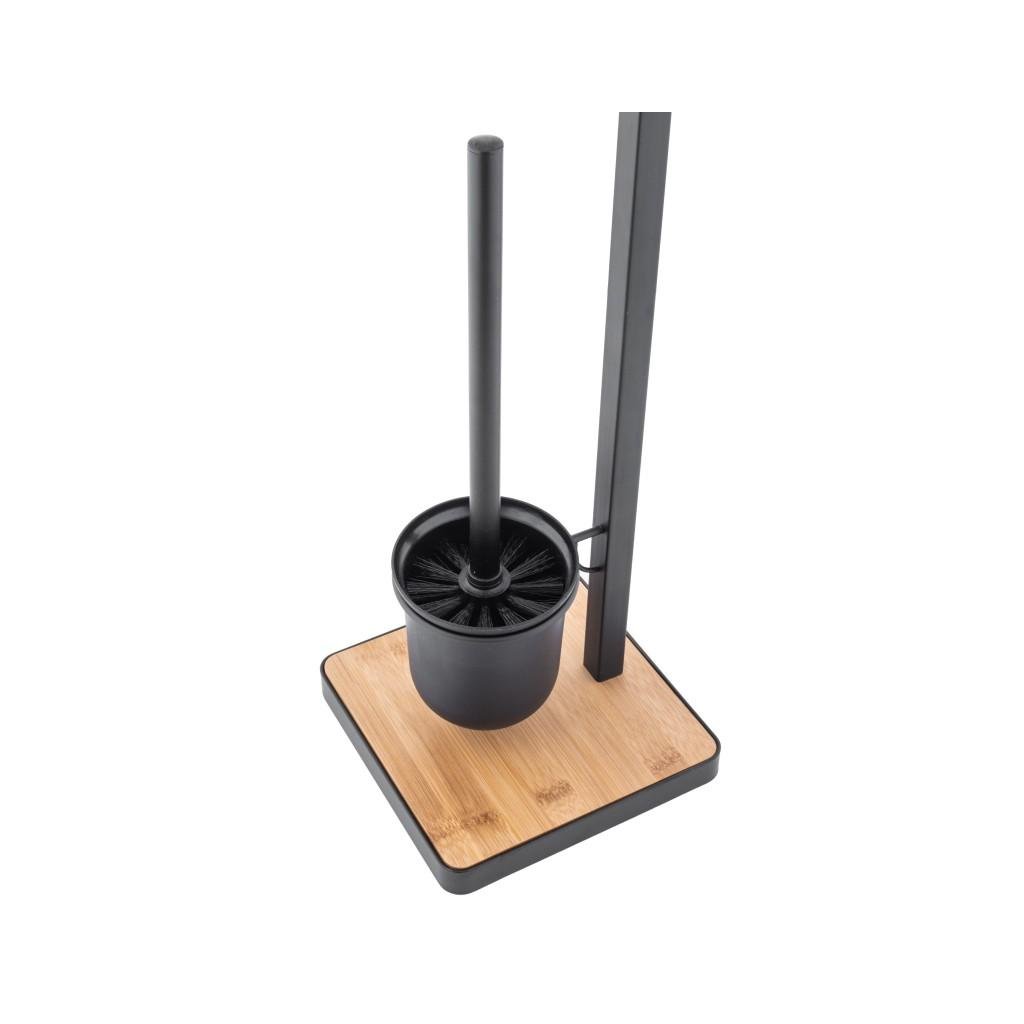 Stojan na toaletu 2 v 1 s toaletním kartáčem a držákem na toaletní papír. Černý stojan vyrobený z lakované oceli s prvky z přírodního bambusového dřeva. Kartáč má plastovou nádobu, která chrání před rzí a usnadňuje čištění. Široká základna a plastové podložky poskytují vynikající stabilitu.
