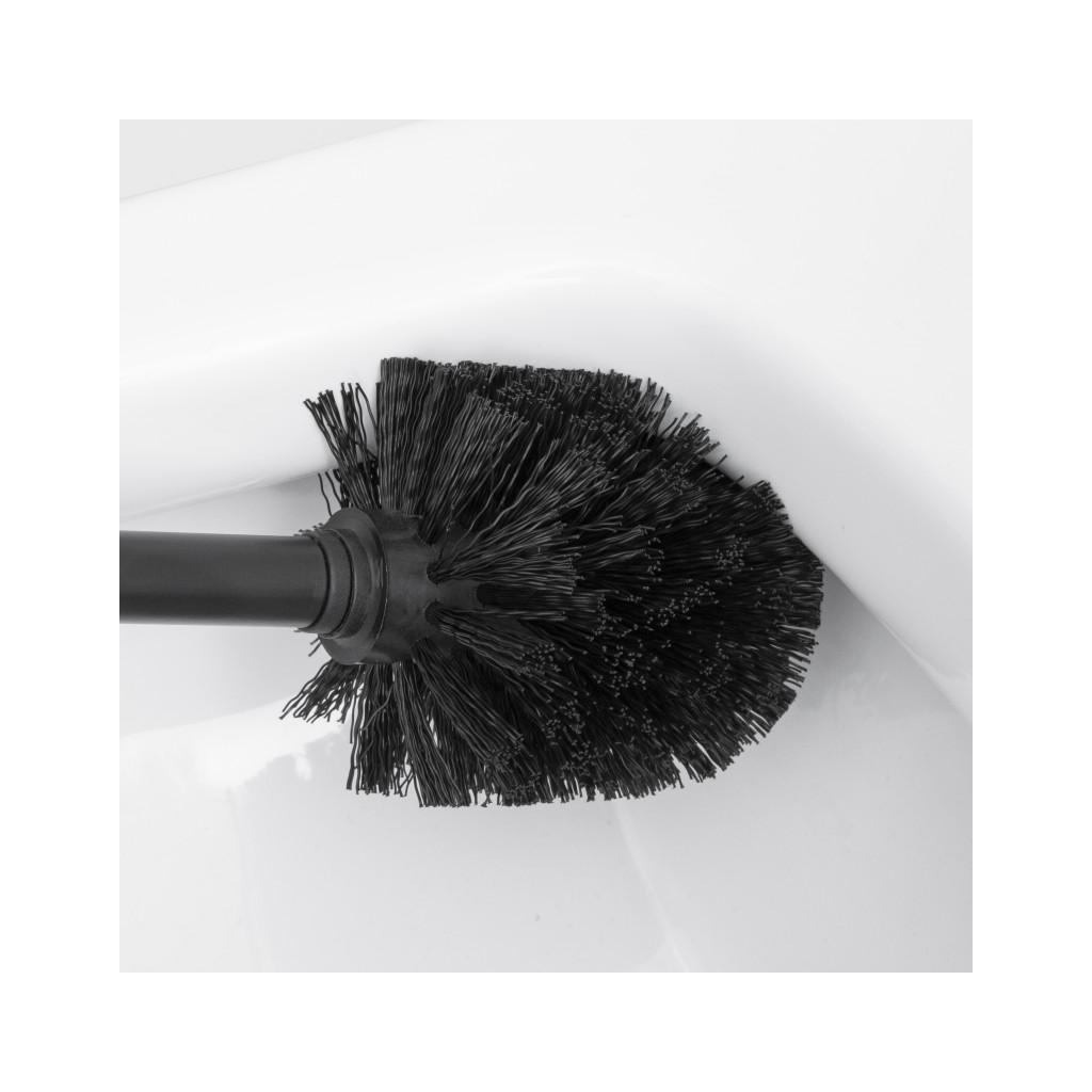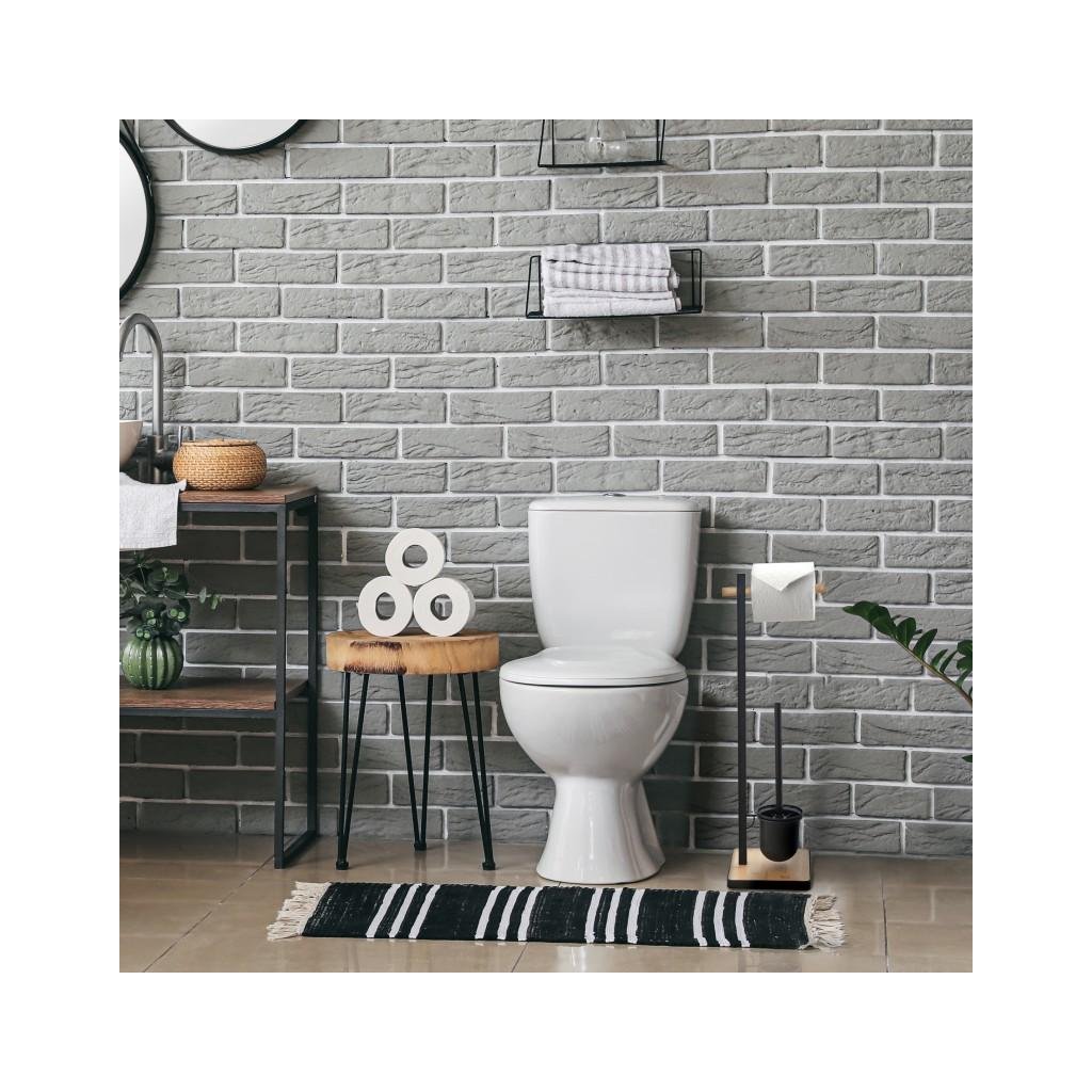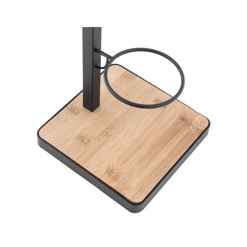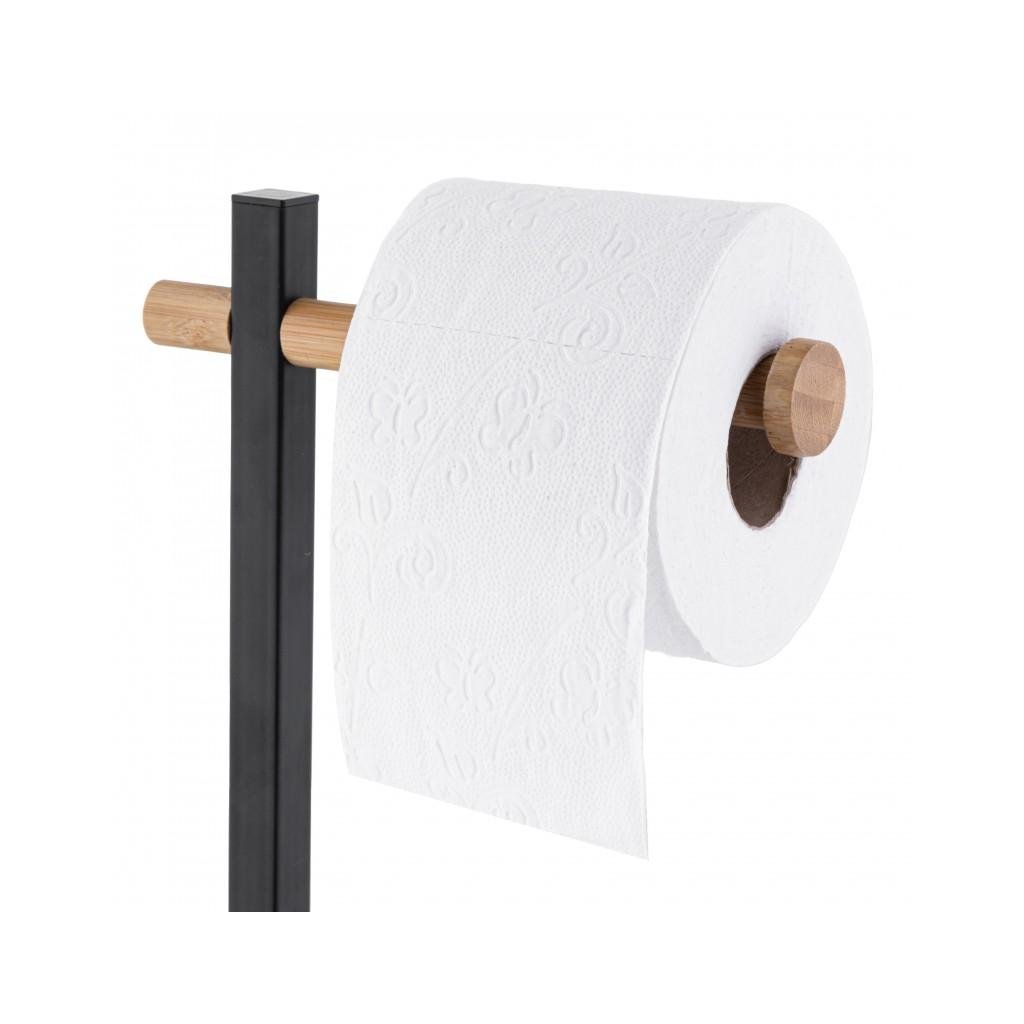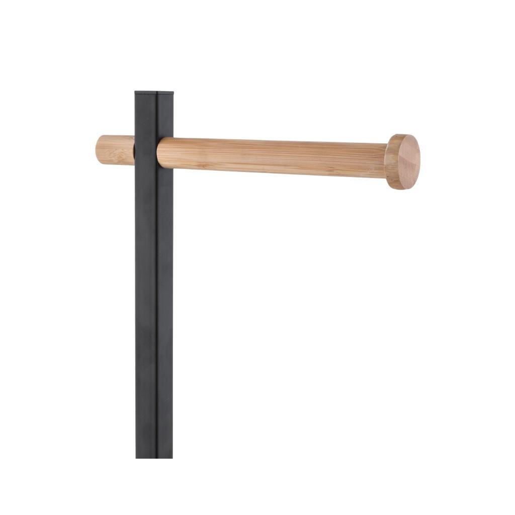 Stojan na toaletu 2 v 1 s toaletním kartáčem a držákem na toaletní papír. Černý stojan vyrobený z lakované oceli s prvky z přírodního bambusového dřeva. Kartáč má plastovou nádobu, která chrání před rzí a usnadňuje čištění. Široká základna a plastové podložky poskytují vynikající stabilitu.