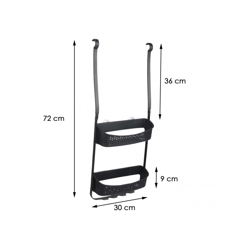 Černá sprchová police, která ušetří spoustu místa. Má dva profilované plastové koše a čtyři háčky, které výrazně zvyšují její schopnosti. Police jsou vybaveny otvory, které zajišťují volné kapání vody. Díky flexibilním gumovým závěsům lze organizér zavěsit na rameno dešťové sprchy nebo na horní okraj dveří kabiny. Organizér má 4 přísavky, díky kterým bude stabilní a po připevnění ke sklu nebo dlaždicím se nebude houpat ze strany na stranu. Přísavky lze snadno demontovat. Dokonale pojme všechny potřebné koupelnové doplňky. Navrženo pro lidi, kteří oceňují solidní zpracování a praktičnost.