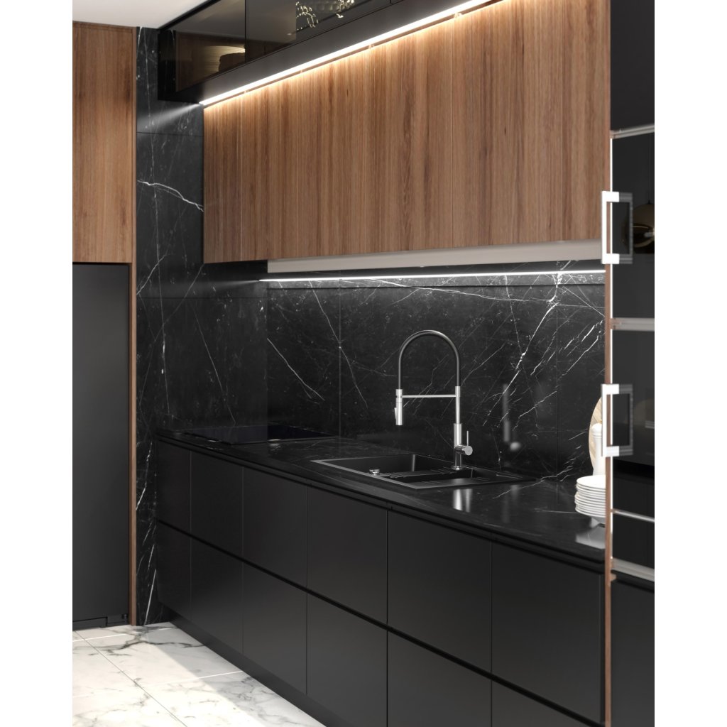 Baterie dokonale zapadá do moderních kuchyňských aranžmá. Hezký tvar a vynikající proporce v kombinaci s černou barvou a lesklým chromem zdůrazní elegantní charakter naší kuchyně. Budou se také hodit k prvkům zařízení v tmavé barvě. Baterie má pružný, otočný a výtok, který nám umožní pohodlně mýt i plnit misky s vodou umístěné mimo kuchyňský dřez.