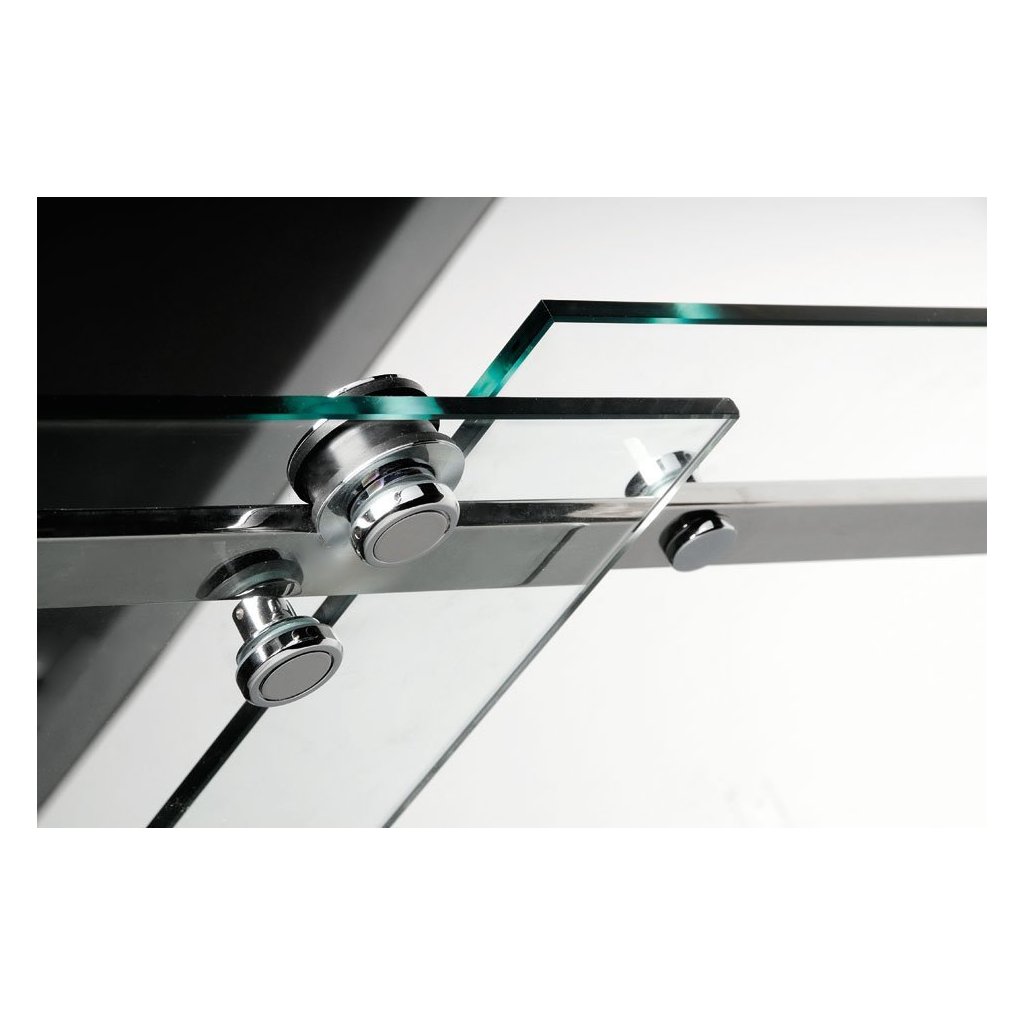 Dveře z bezpečnostního skla jsou zavěšeny a jejich pohyb usměrňuje vodící díl na podlaze. Je tak umožněn bezbariérový vstup.