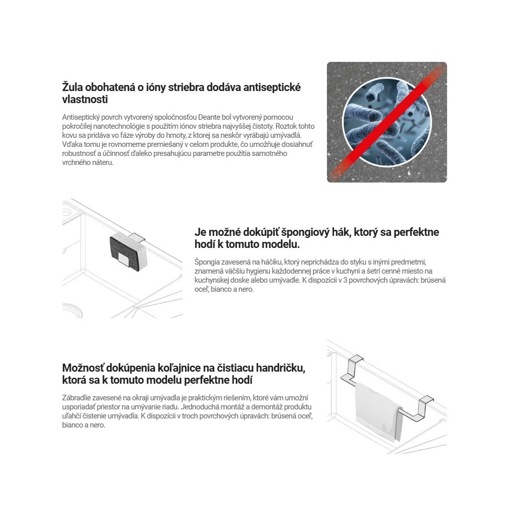 Antiseptické povrchy vytvořené pomocí Deante byly vytvořeny pomocí pokročilé technologie nanopartite pomocí vysoké purity stříbrné ionty. Řešení tohoto kovu je doplněno o výrobní fázi do hromady z nichž syny jsou vyrobeny later. Jako výsledek, je to eventuálně smíšené prostřednictvím produktu, zajišťující požadovanou durabilitu a efektivitu, které významně exceeds parametry používající pouze nejvyšší coating.