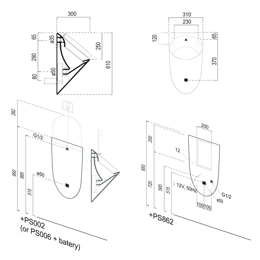 - Při instalaci s automatickým splachovačem PS002 je nutné instalovat i napájecí zdroj (PS05T nebo PS10T).