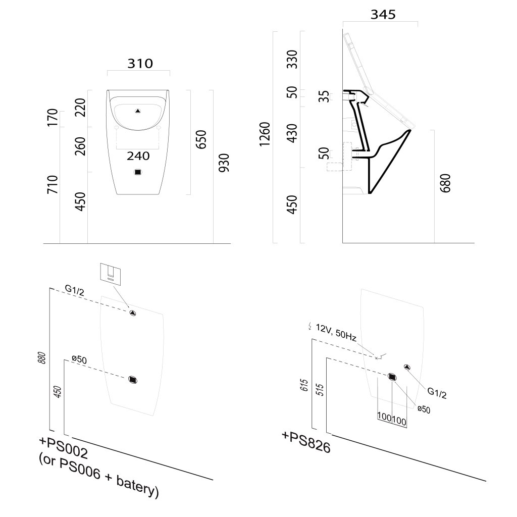 - Při instalaci s automatickým splachovačem PS002 je nutné instalovat i napájecí zdroj (PS05T nebo PS10T).