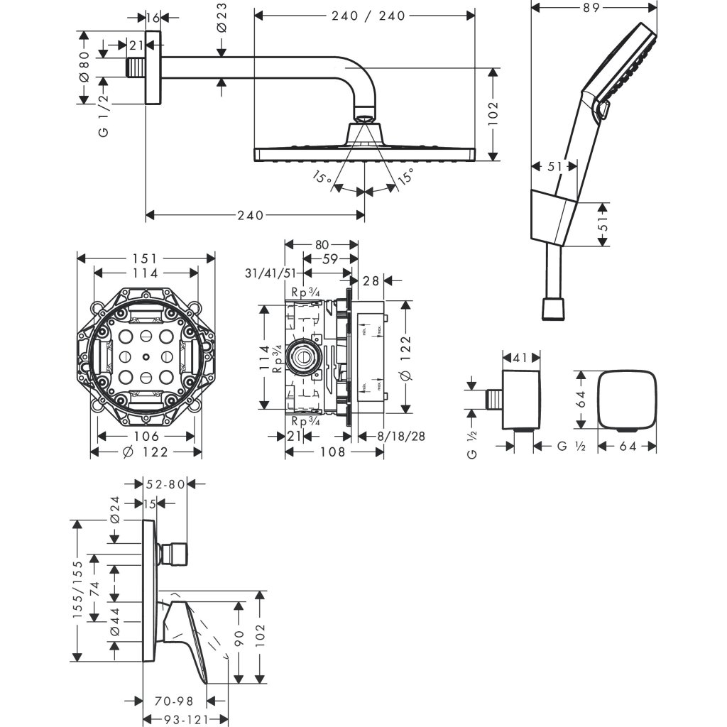 - Rozměr sprchové hlavice: 240 x 240 mm