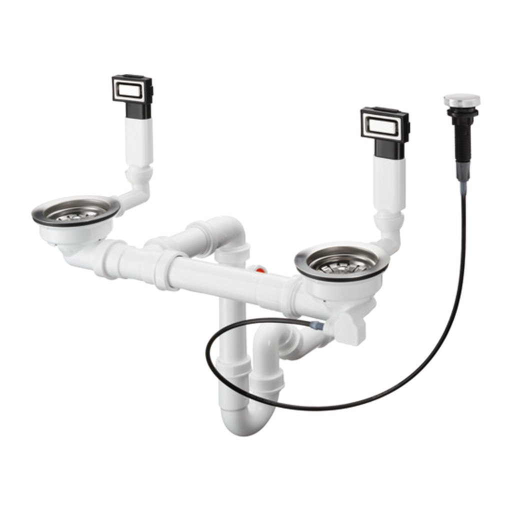 - Odtokový systém: ovládání odtoku velkého dřezu otáčením excentru, ovládání odtoku malého dřezu zatlačením/vytažením sítka