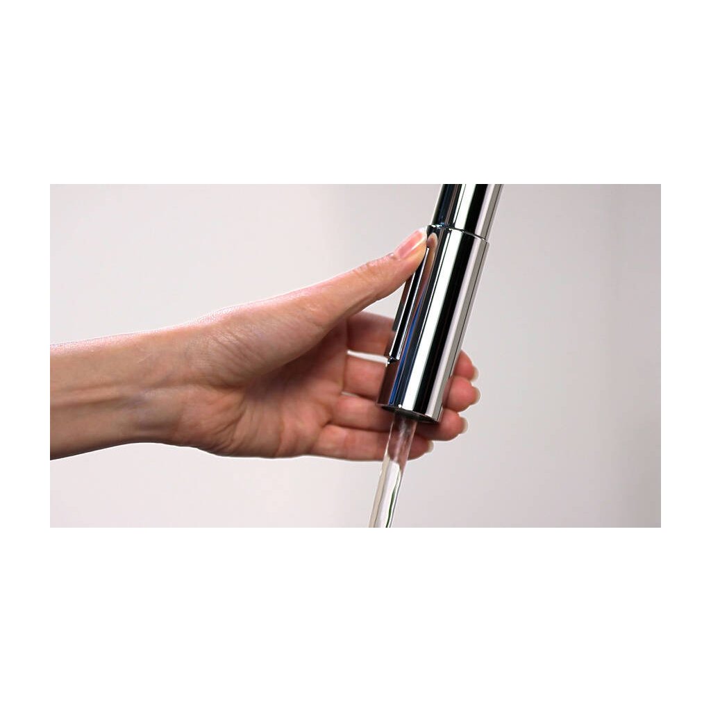 - Sprchový proud aretovatelný, přepínání proudu stisknutím tlačítka a automatické zpětné přepínání proudu při zavření baterie.
