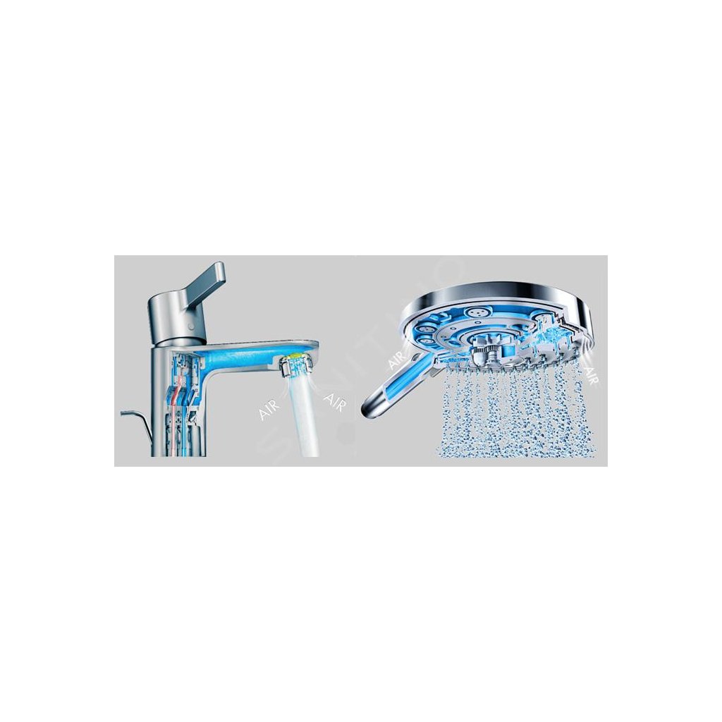 Technologie, která obohacuje vodu nasávaným vzduchem a vytváří tak plnější, lehčí a měkčí kapky. Na jeden litr vody připadnou cca. tři litry vzduchu. Stačí pohled na vodu vytékající z kohoutku baterie nebo na disk vodních paprsků u sprchy a zjistíte, jaké výhody AirPower přináší. Tato technologie tiše a spolehlivě zvětšuje objem každé kapky a snižuje nepříjemné stříkání vody. Perlicí sprchový deštík AirPower pohltí Vaše tělo a vytvoří příjemný pocit blaha. Výsledek pocítíte ihned na vlastní kůži.