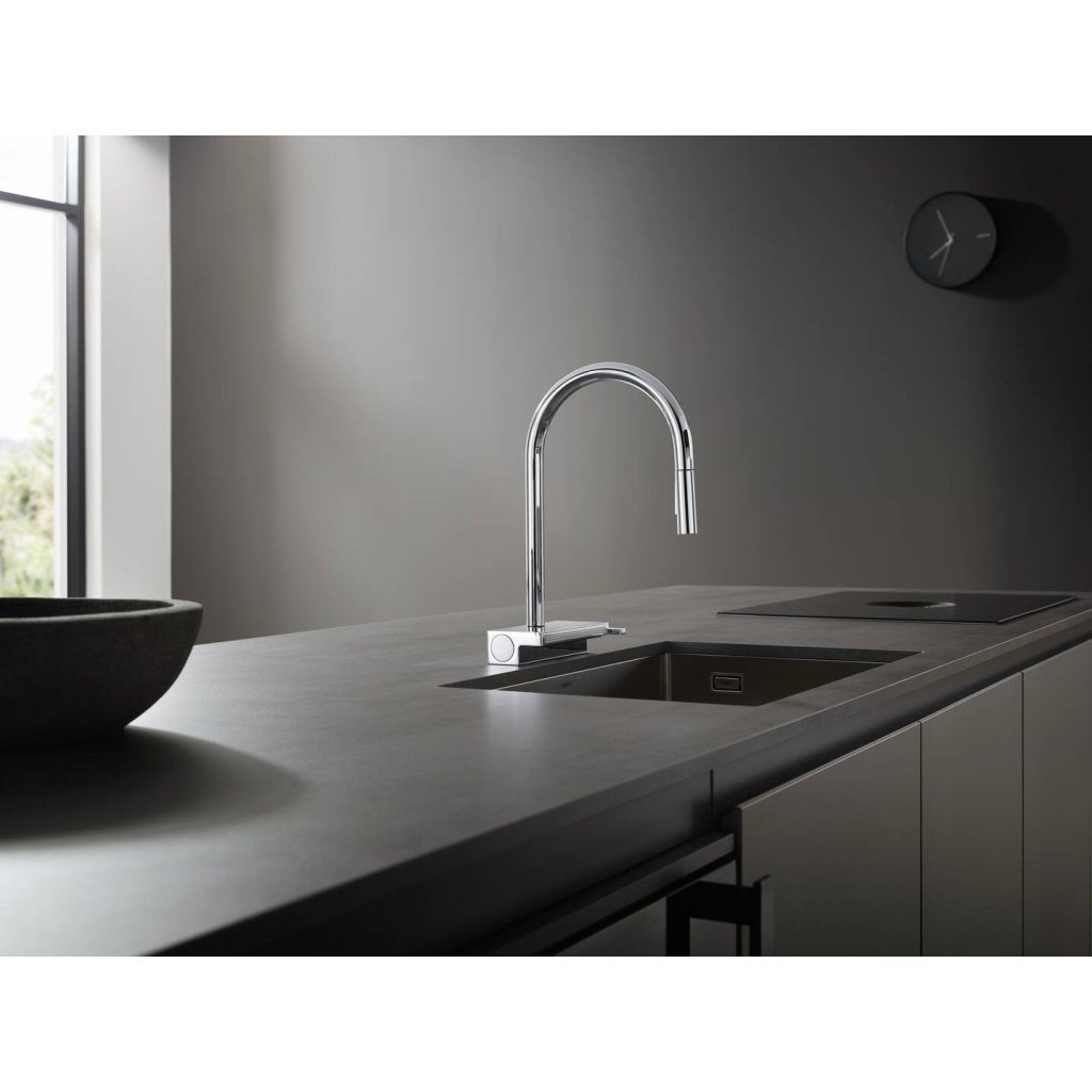 Designová kuchyňská baterie se zcela novým druhem laminárního sprchového proudu SatinFlow, který je tvořen 133 samostatnými tenkými vodními paprsky. Ty jemně a účinně obtékají křehké suroviny, což umožňuje jejich důkladnější a šetrnější mytí. Skvělým řešením je také použití multifunkčního síta, které je navrženo tak, aby se dokonale hodilo pod laminární proud kuchyňské baterie.