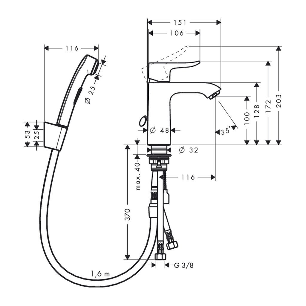 - Zahrnuje: páková umyvadlová baterie, ruční sprcha Bidette, sprchový držák, sprchová hadice, odtoková souprava
