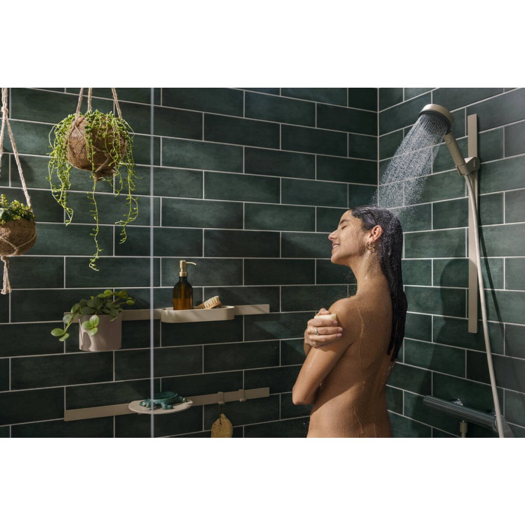 Další ekologický bonus: sprchová hlavice Pulsify 105 edice Planet nejen šetří teplou vodu a energii, ale při její výrobě se používá také recyklovaný plast z výroby. Podporujete tak důležitý krok k oběhovému hospodářství. Šetří to cenné zdroje, aniž by se ovlivnil požitek ze sprchování. Jemně strukturovaný povrch pískové barvy zdůrazňuje recyklovaný vzhled a představuje originální alternativu k tradičnímu chromu.