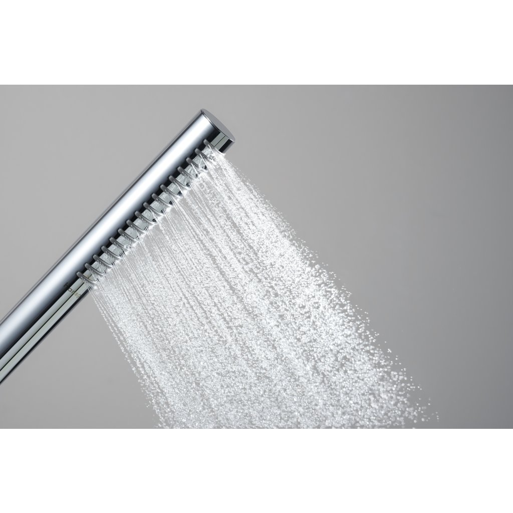 Proudové trysky rozmístěné po velké ploše válcové sprchové hlavice zajišťují perfektní distribuci vody. Výrazně minimalistický design ruční sprchy upoutá pozornost při přizpůsobení koupelny a nabízí se v různých úpravách povrchů od leštěného chromu, černé a bílé barvy až po prémiovou metalickou úpravu povrchu broušeného bronzu.