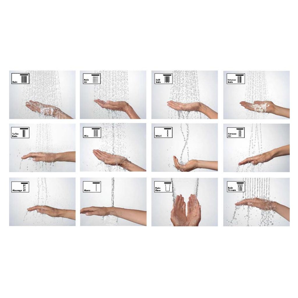 Horní sprcha nabízí intenzivní proudy vody RainAir , které jsou efektivnější i díky rozměrům samotné sprchové hlavice (300x300 mm). Úhel horní sprchy lze navíc díky kulovému kloubu přizpůsobit. Máte tedy šanci být jemným vodním proudem doslova pohlceni, čímž získáte šanci se na chvíli vzdálit od problémů všedních dnů. Ruční sprcha je vybavena sprchovou hadicí. V případě potřeby ji můžete umístit do pojízdného držáku. Jezdec lze naklápět (k dispozici je úhel 90°) i natočit. Sprchy snadno ubráníte před vodním kamenem, protože ten stačí díky technologii QuickClean jednoduše setřít prsty.