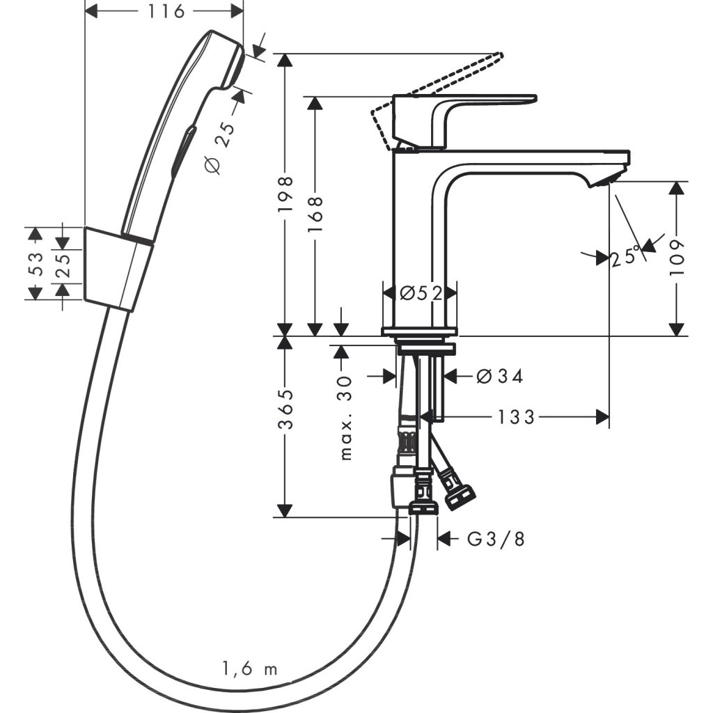 - Typ: páková umyvadlová baterie s ruční sprchou Bidette a sprchovou hadicí