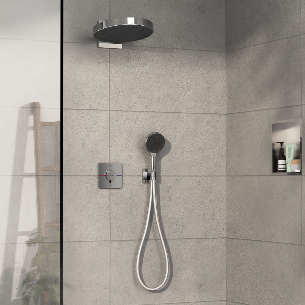 Podomítkový termostat ShowerSelect Comfort Q společnosti hansgrohe je první volbou, kdy je přívod vody pod úrovní hladiny vody (např. hansgrohe Exafill) díky ochraně proti zpětnému toku podle normy EN1717. Zároveň designově zvýrazňuje koupelnu. Ultraplochý design nabízí více prostoru ve sprše nebo ve vaně díky minimální instalační výšce. Elegantní stínová mezera vytváří dojem, že se termostatická baterie zdánlivě ve stavu beztíže vznáší před stěnou.