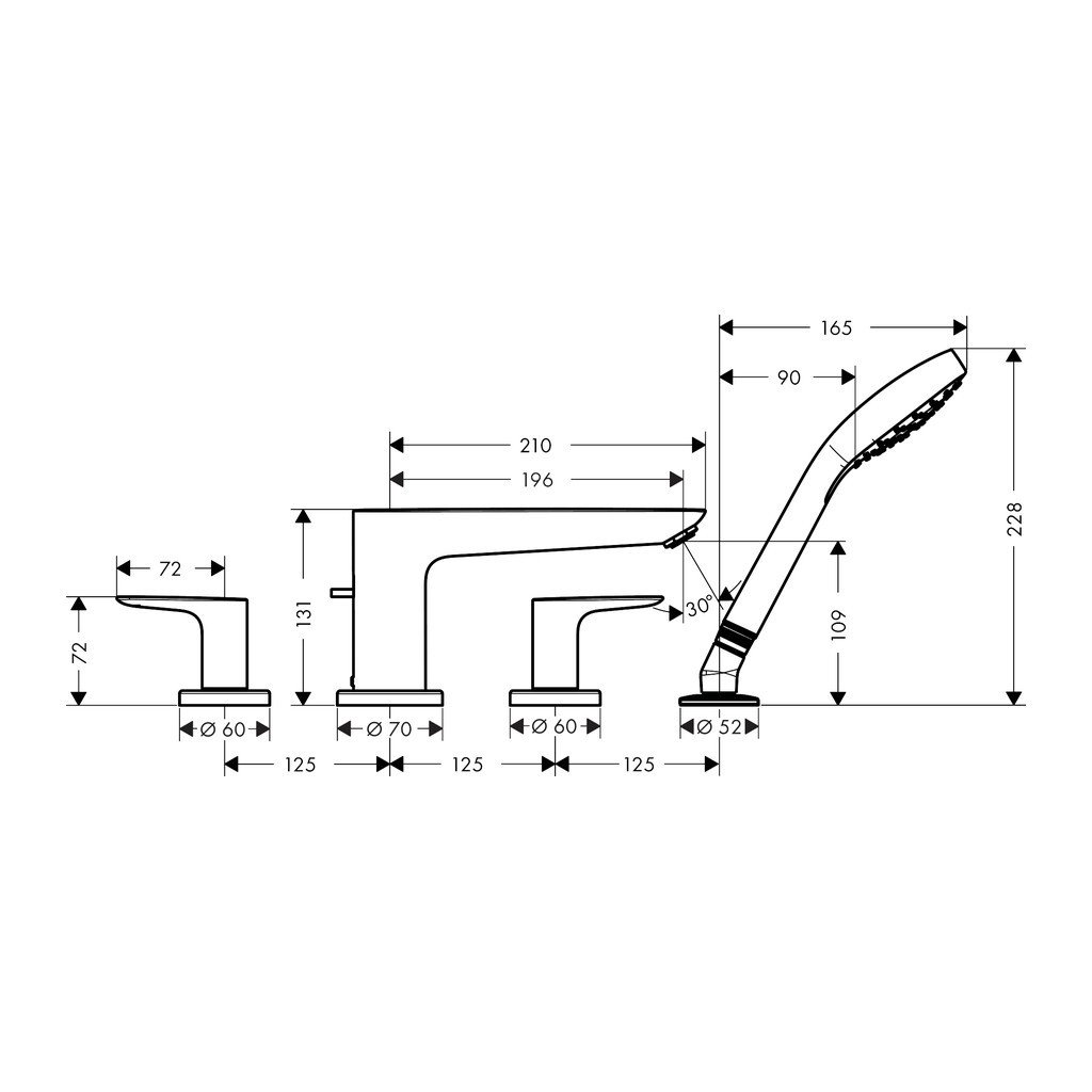 - Obsahuje: čtyřotvorová armatura na okraj vany, ruční sprchy, hadicová souprava Secuflex