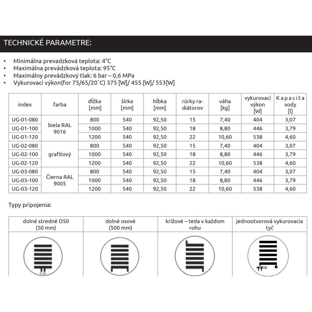 • Vhodné typy připojení: dolní středové D50 (50mm), dolní osové (500 mm), křížové – tedy v každém rohu, jednootvorová topná tyč